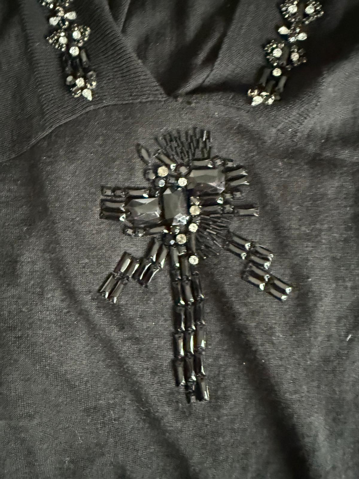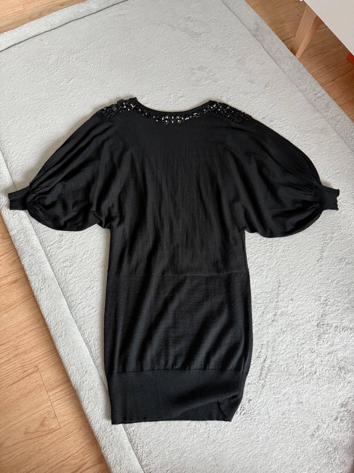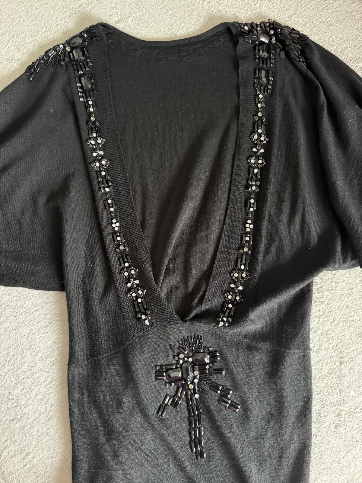 Description: Backless black knit jumper dress size S Thin weight wool material. Beautiful embellishments Very sexy!
