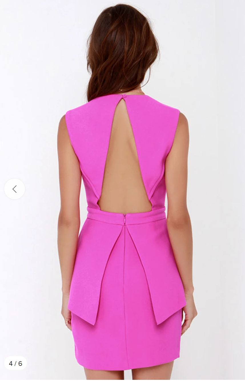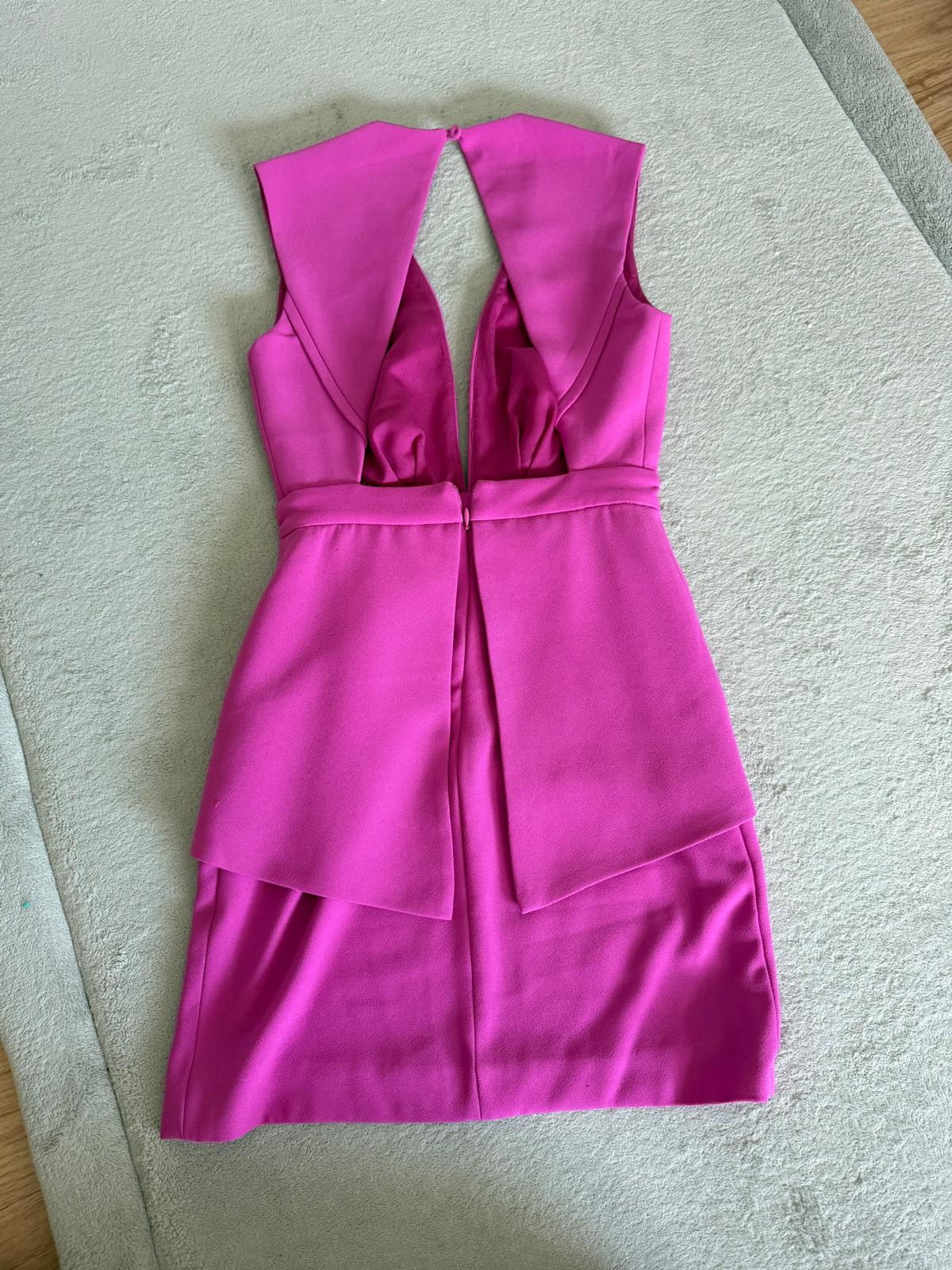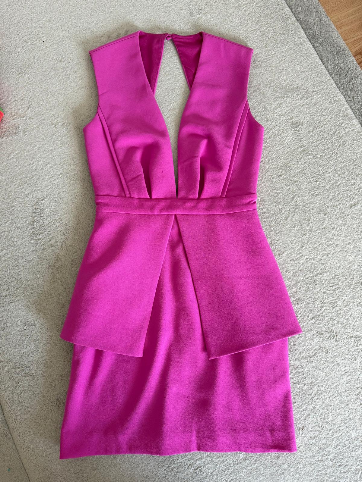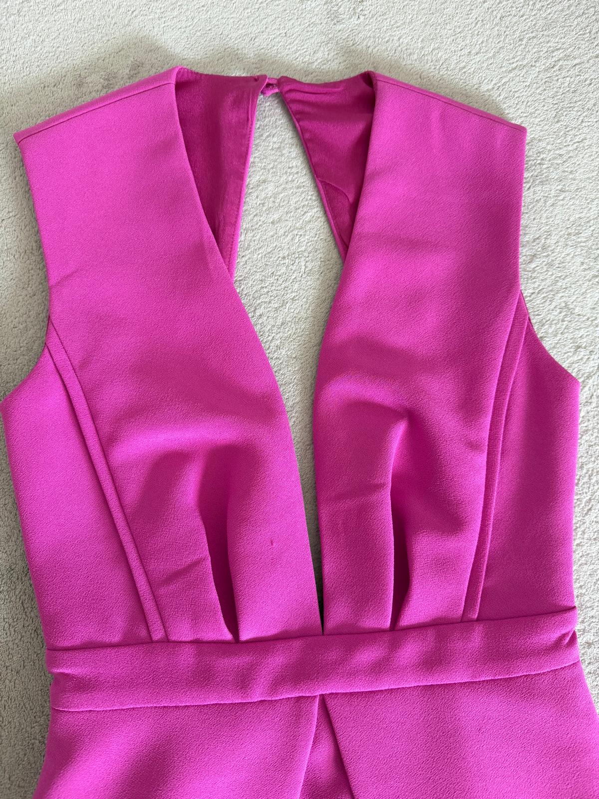 Description: Vibrant pink mini dress from Finders Keepers features a unique design with a deep V-neck and an open back. It has a structured bodice with a defined waist and a layered skirt detail. It's a stylish choice for a night out or special occasion. Only worn once in perfect condition.