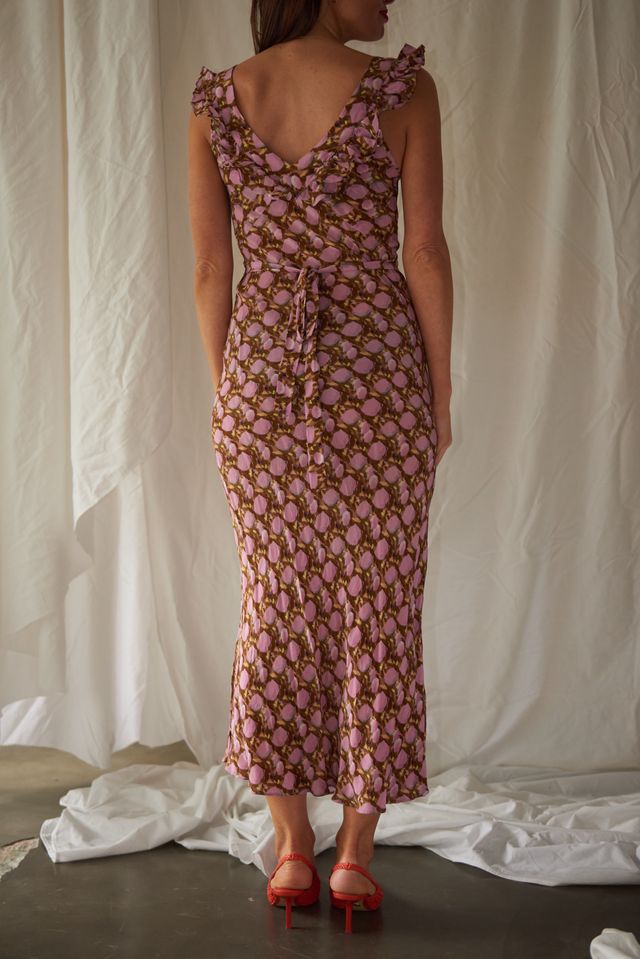 Description: Doen inspired floral midi dress, frill neckline and tie back Perfect for weddings