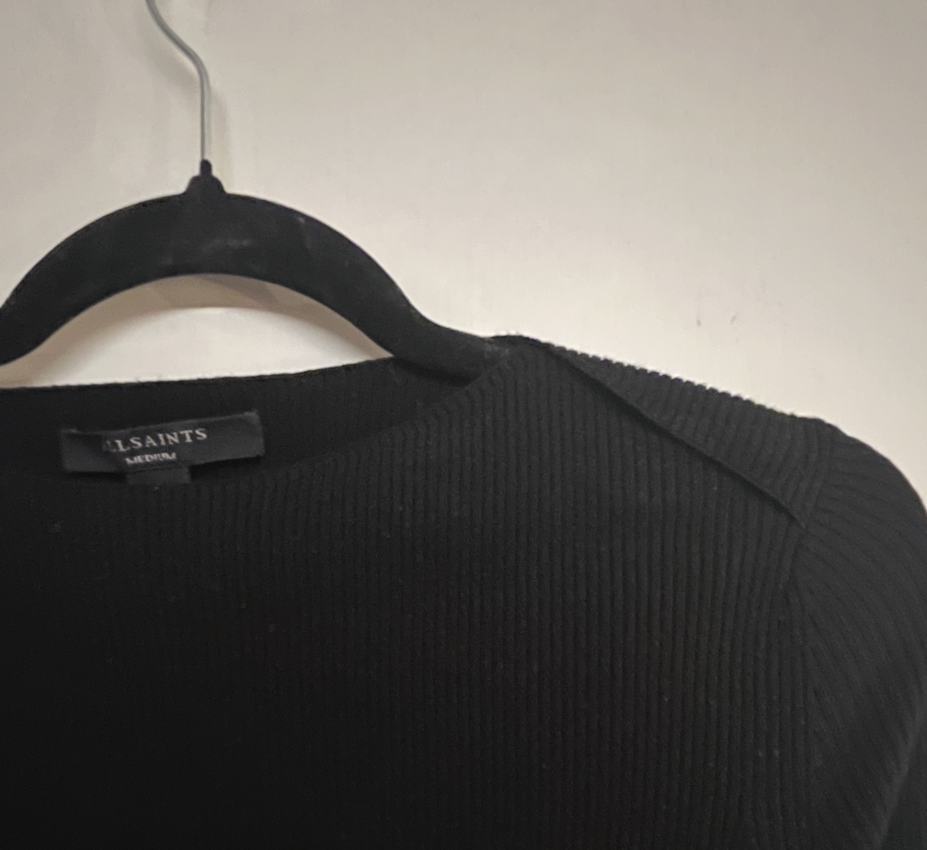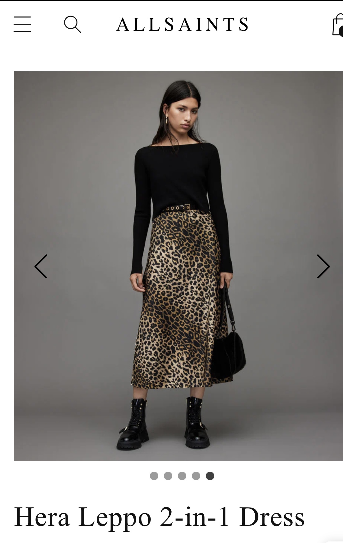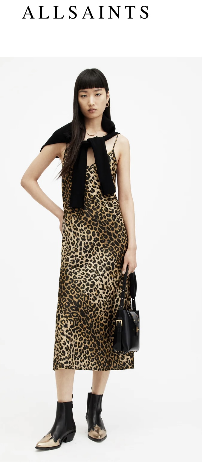 SaveDescription: Signature 2in1 style dress by All Saints featuring a midi length silky leopard-print slip dress with adjustable straps and a separate cropped ribbed slashneck sweater to wear on top. Both can be worn separately. Size medium, slim fit - best for a UK 8 or slim 10. Perfect for date night or cocktails with heels & clutch and can be grunged up with a leather jacket and boots for casual occasions.
