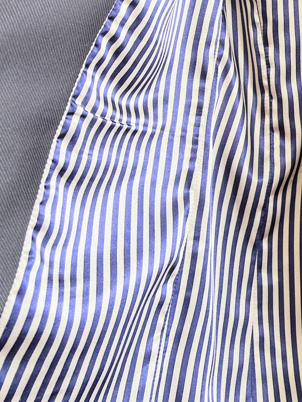 Description: Statement piece! Fabulously tailored deconstructed blazer by local designer Spy by Henry Lau. The lining is stripy navy and cream silk. As new