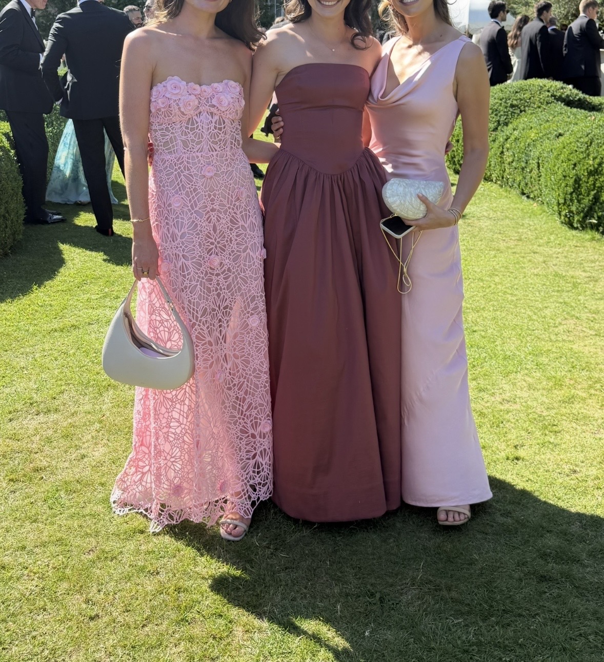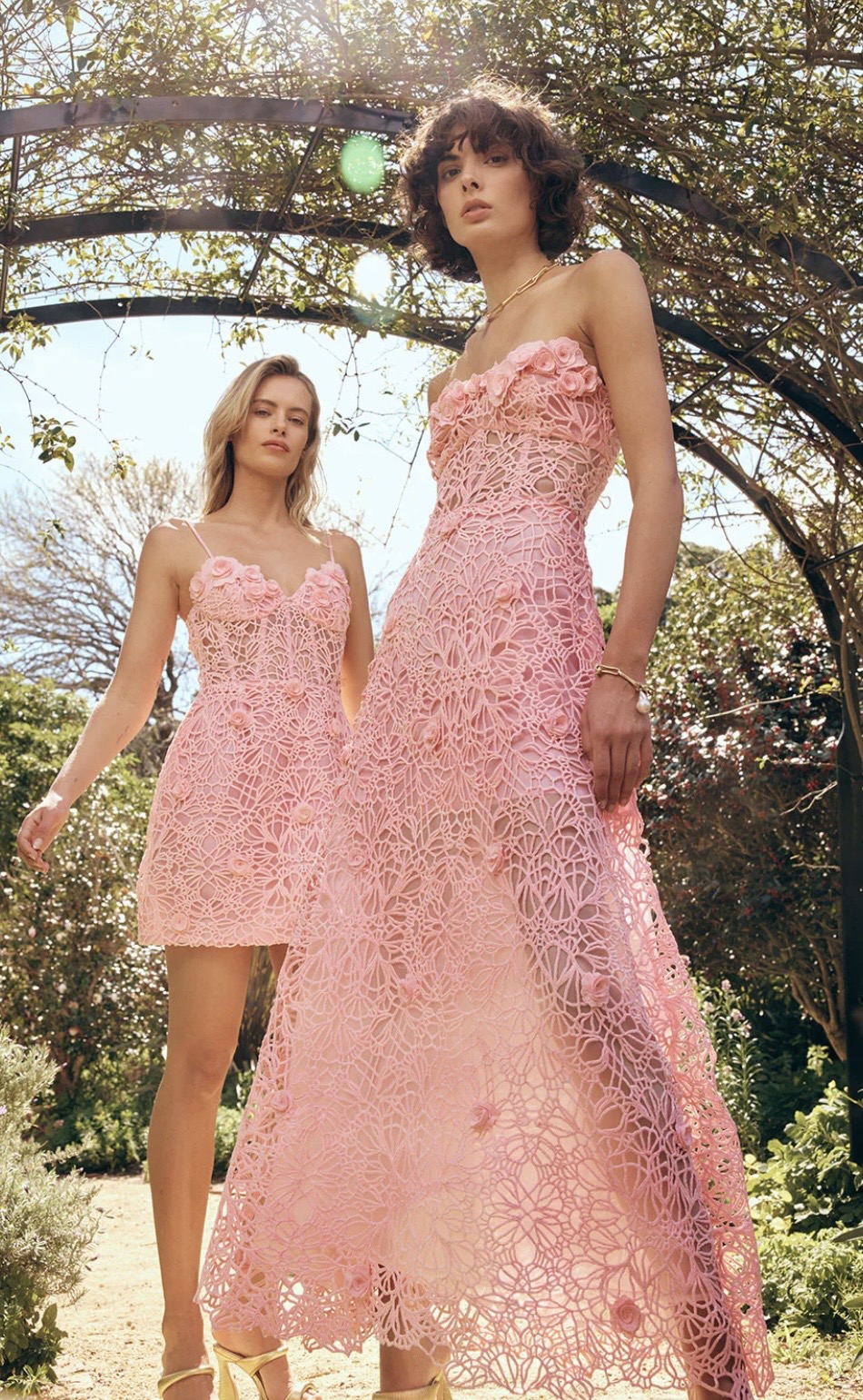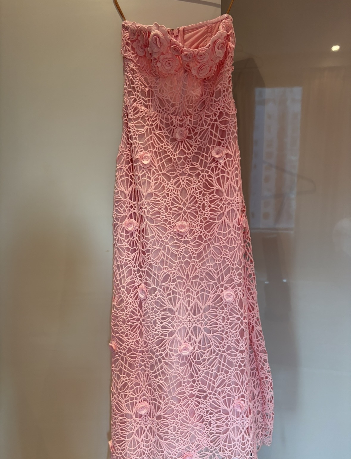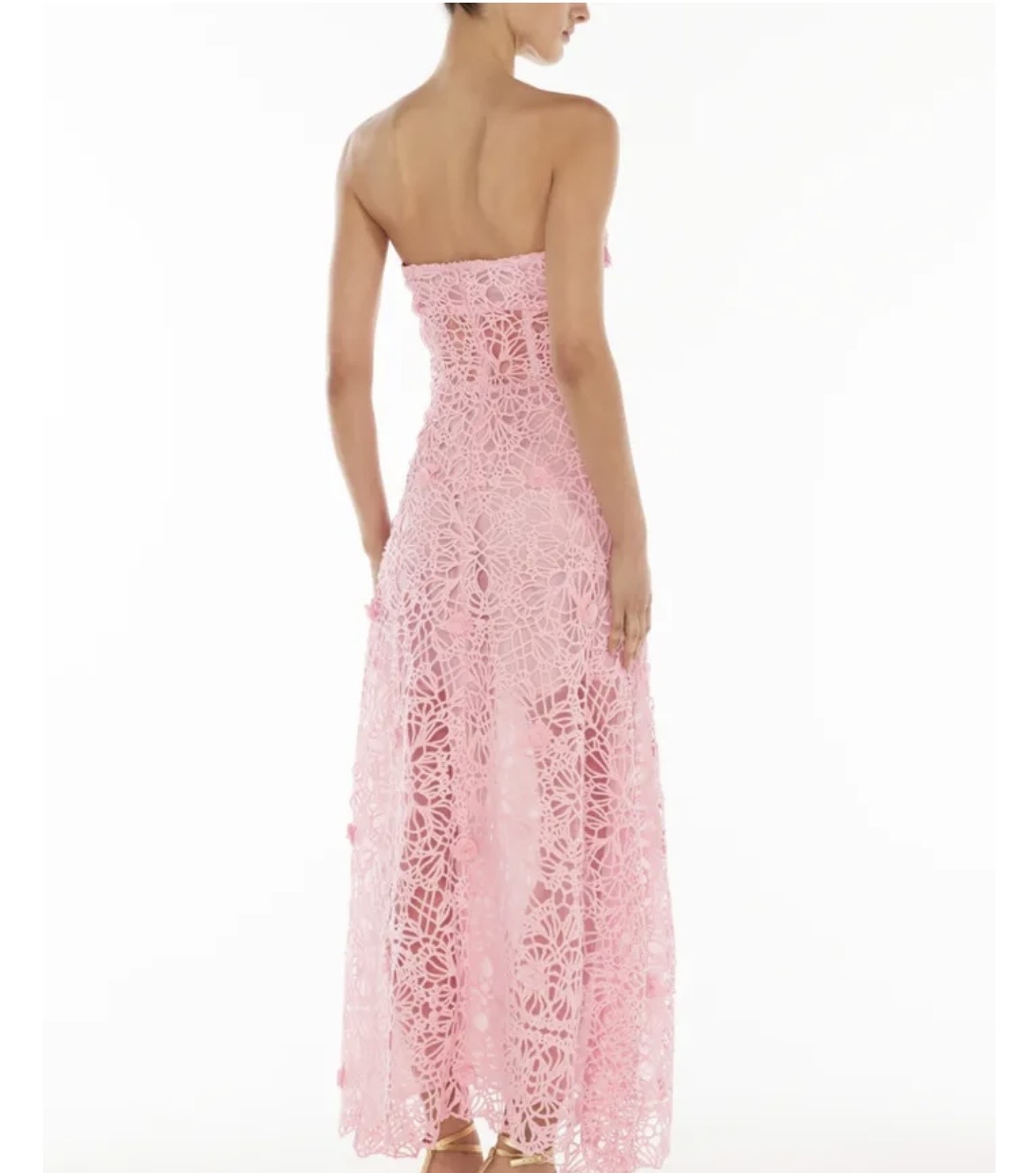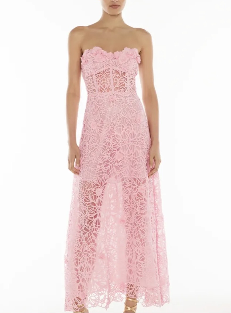 SaveDescription: Strapless gown is crafted from corded lace. In great condition. Only worn twice!