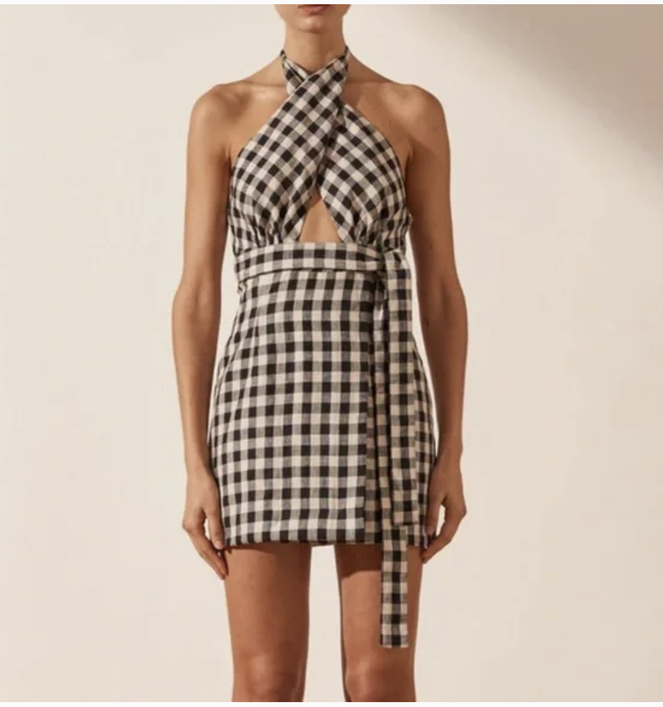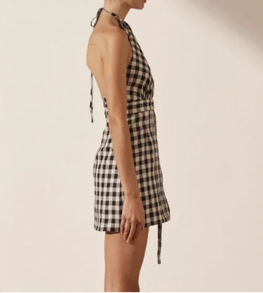 SaveDescription: UK 8 Pure textured linen High halter neckline Adjustable tie straps Cross front bodice with cut out detail Open back Invisible back zip Wrap mini length skirt Medium weight, non-stretchy woven 100% Linen Lined Designed in Australia Made in China