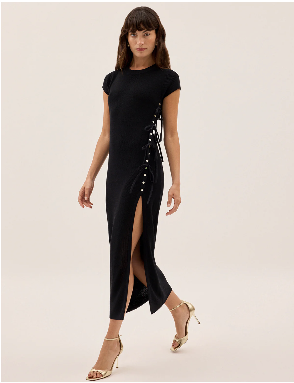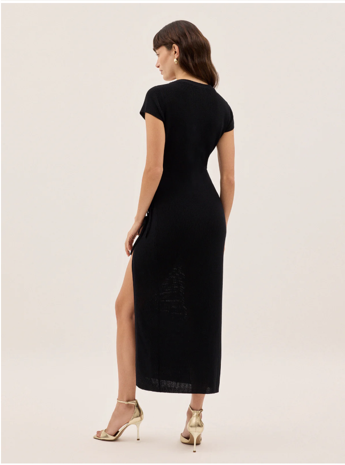 SaveDescription: It's brand new, unworn with tags :) Designed with a classic round neckline and a body-skimming fit, it features an asymmetric front button closure with adjustable tie details and a dramatic thigh-high split. Equal parts refined and bold, it’s a versatile piece that effortlessly transitions from day to night. Beautiful but ordered it in a size too large. Would love for it to find a new home.