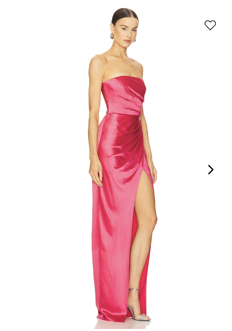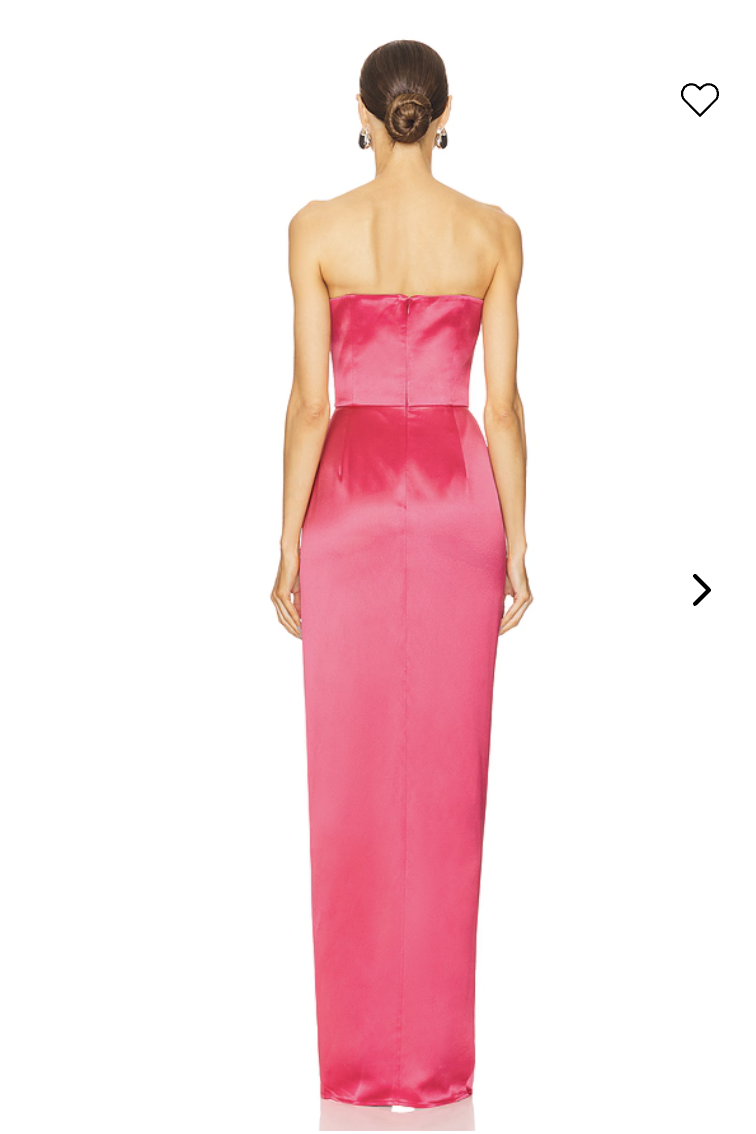 SaveDescription: Can fit a size 8 as well. Shell: 78% acetate, 22% polyester Lining: 97% polyester, 3% spandex Made in China Hand wash Fully lined Hidden back zipper closure Boned bodice Satin fabric with subtle ruching and high seam split