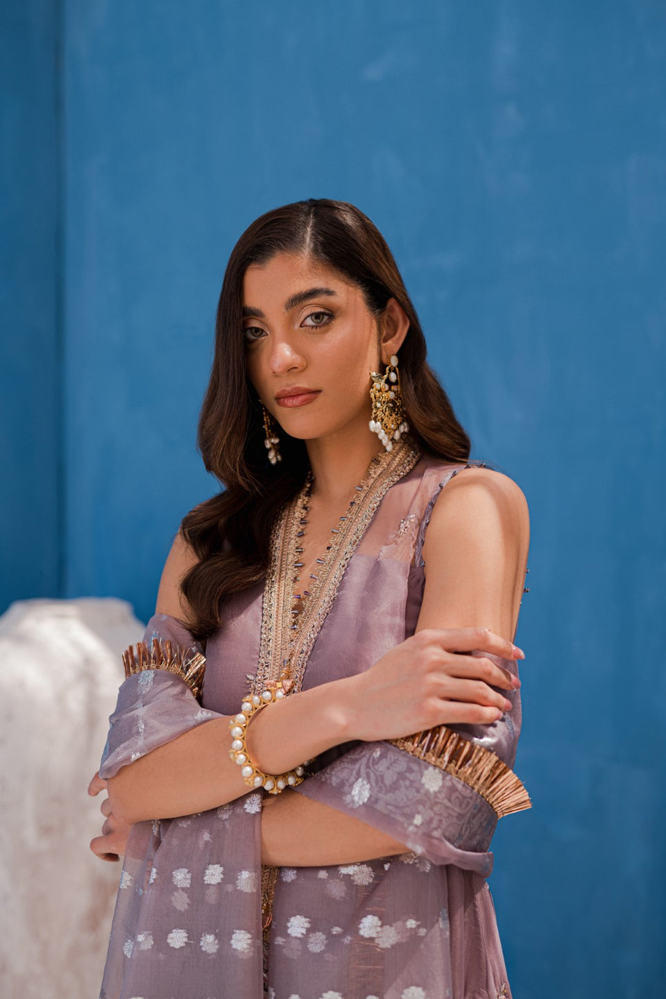 SaveDescription: An understated lilac ensemble made in organza and is layered with delicate tilla and resham, geometrical thread work alongside straight pants prepared in pure raw silk. An amalgamation of stone and crystal cut-beads highlight the mauve undertones, copper protrusions lace their way across the edges of a voluminous organza dupatta complete with handmade tassels, intricate embroidered details coupled with jamawar finishings. The actual outfit features lilac transparent and embroidered sleeves. Bought in February 2026, only worn once. Ideal for occasions and Eastern celebrations like weddings.