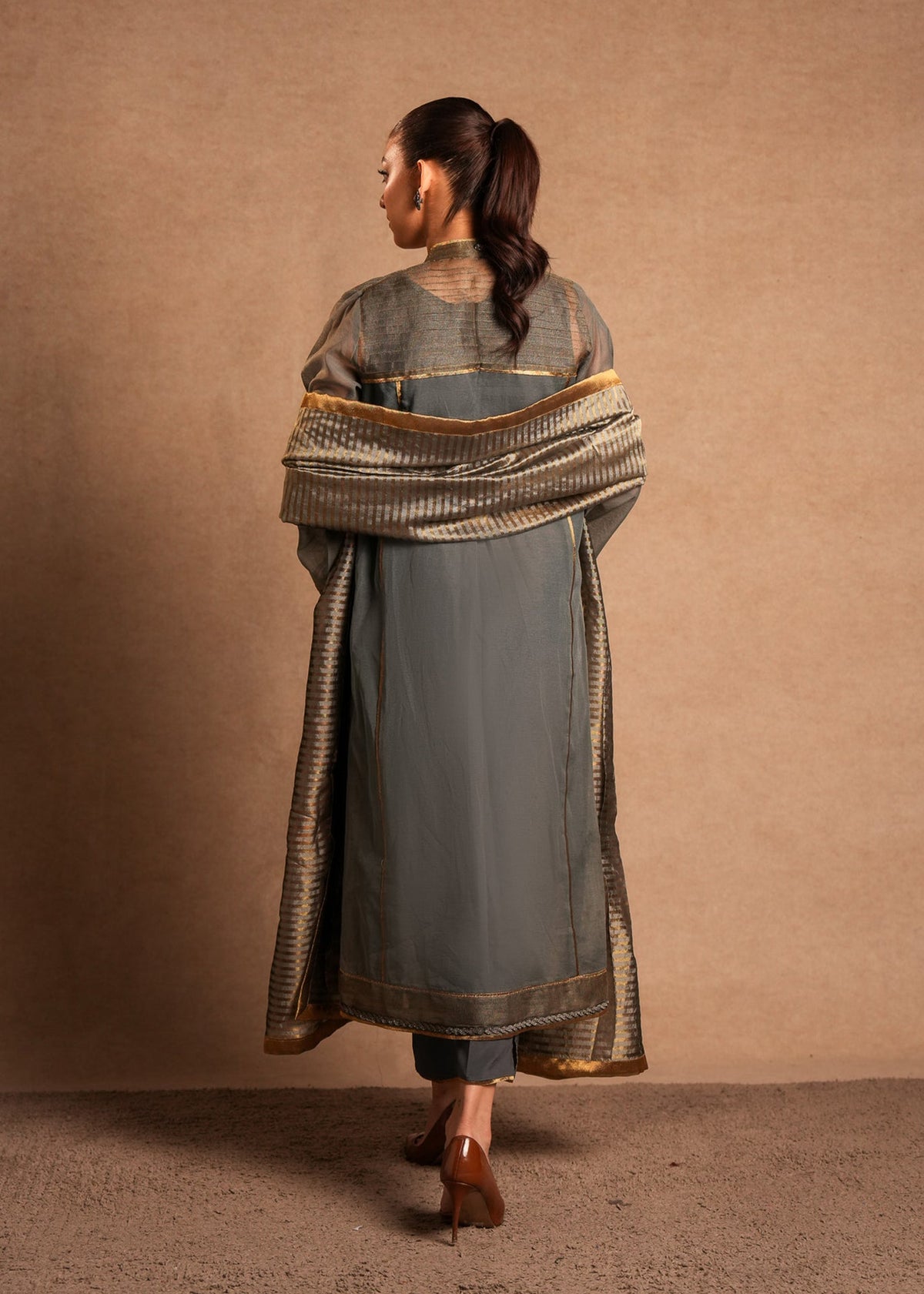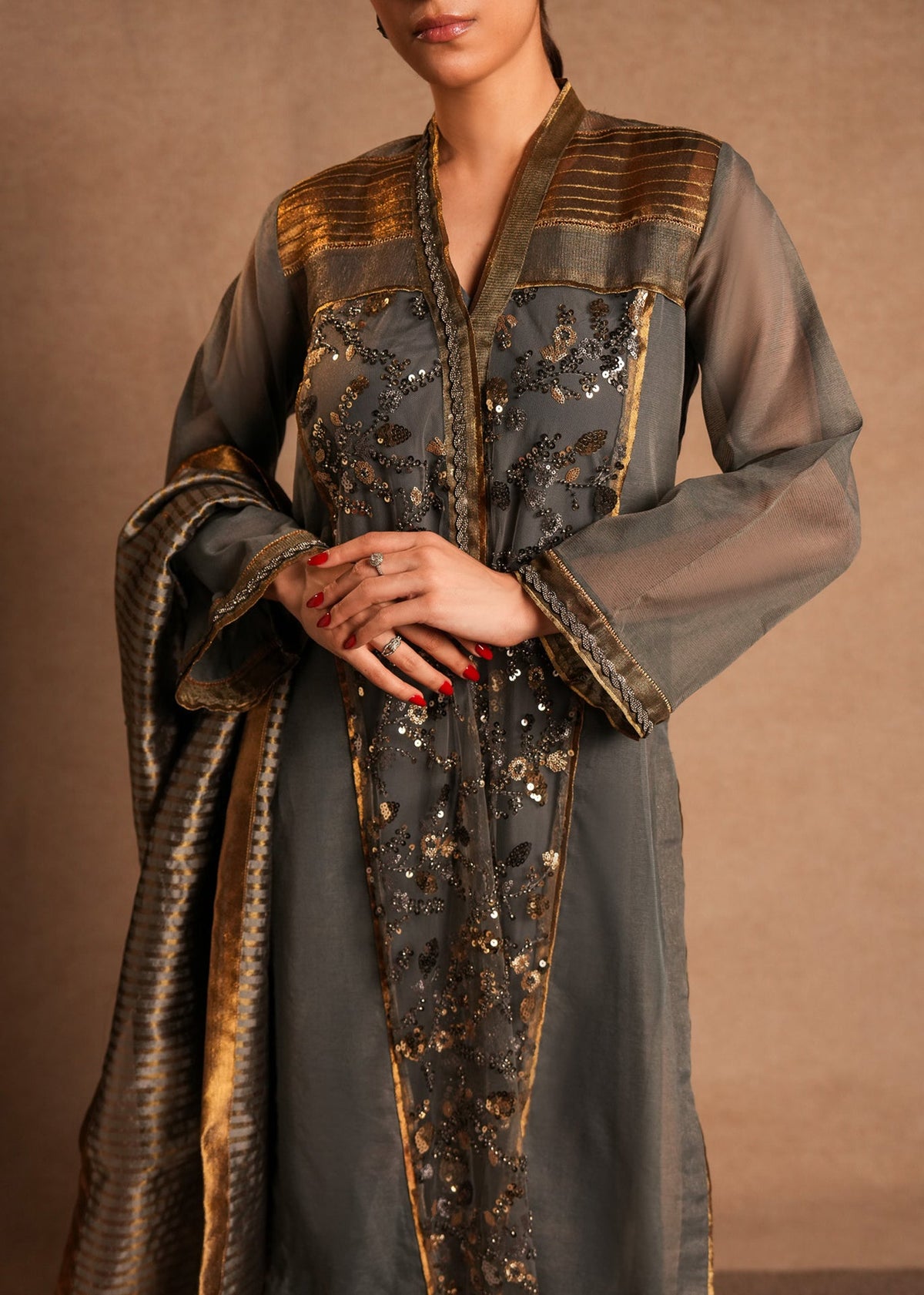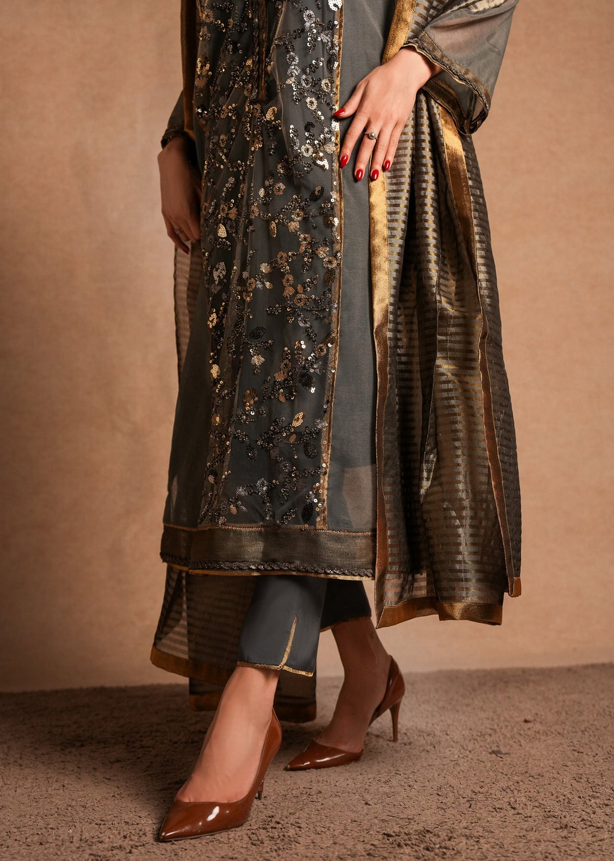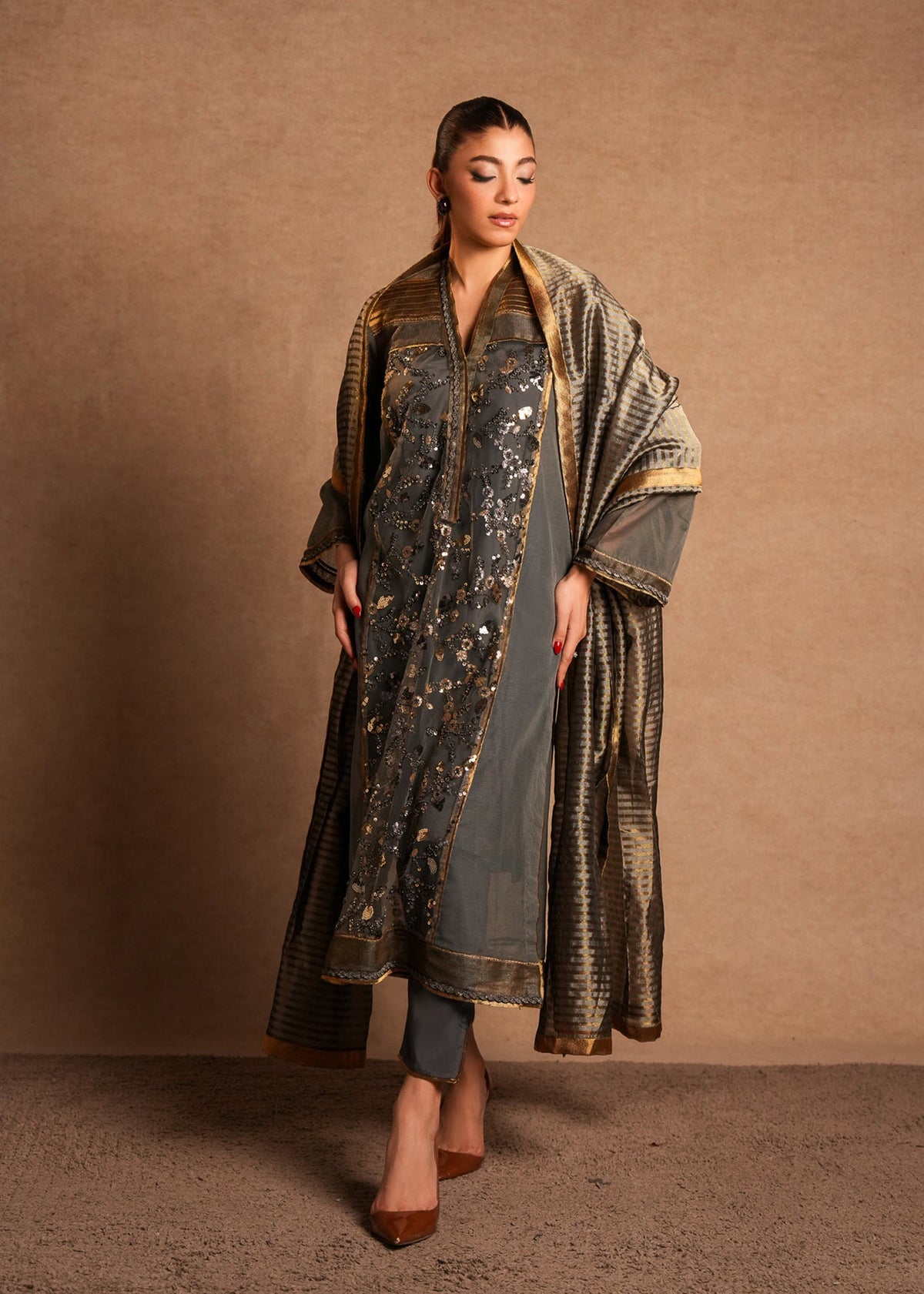 SaveDescription: A grey ensemble with gold-coloured details. It comes with silk straight pants. Finished with embroidered borders. It also includes a dupatta. Bought in February 2026, only worn once. Ideal for occasions and Eastern celebrations like weddings.