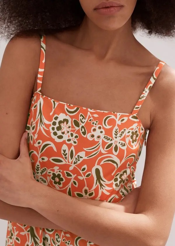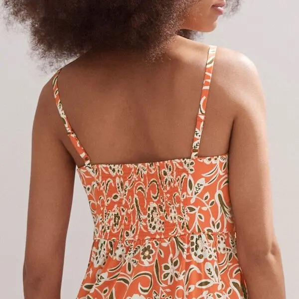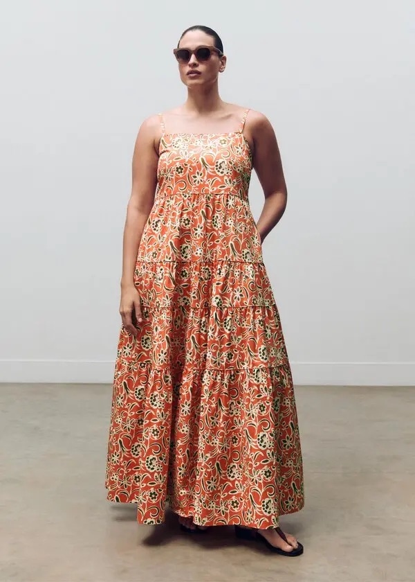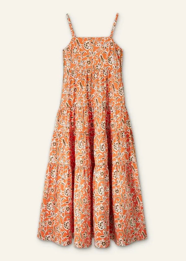 SaveDescription: ME+EM Cotton Graphic Floral Print Maxi Dress in orange and light cream, featuring a tiered design and spaghetti straps.