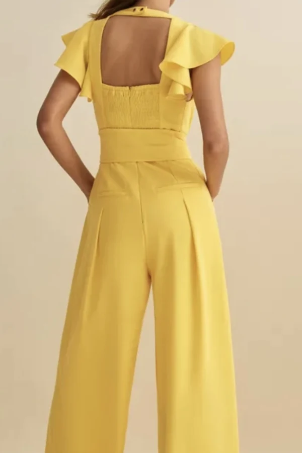 SaveDescription: ME+EM Statement Frill Sleeve Yellow Jumpsuit, featuring a square neck, frilled shoulder straps, and wide legs. Small hole on the shoulder.