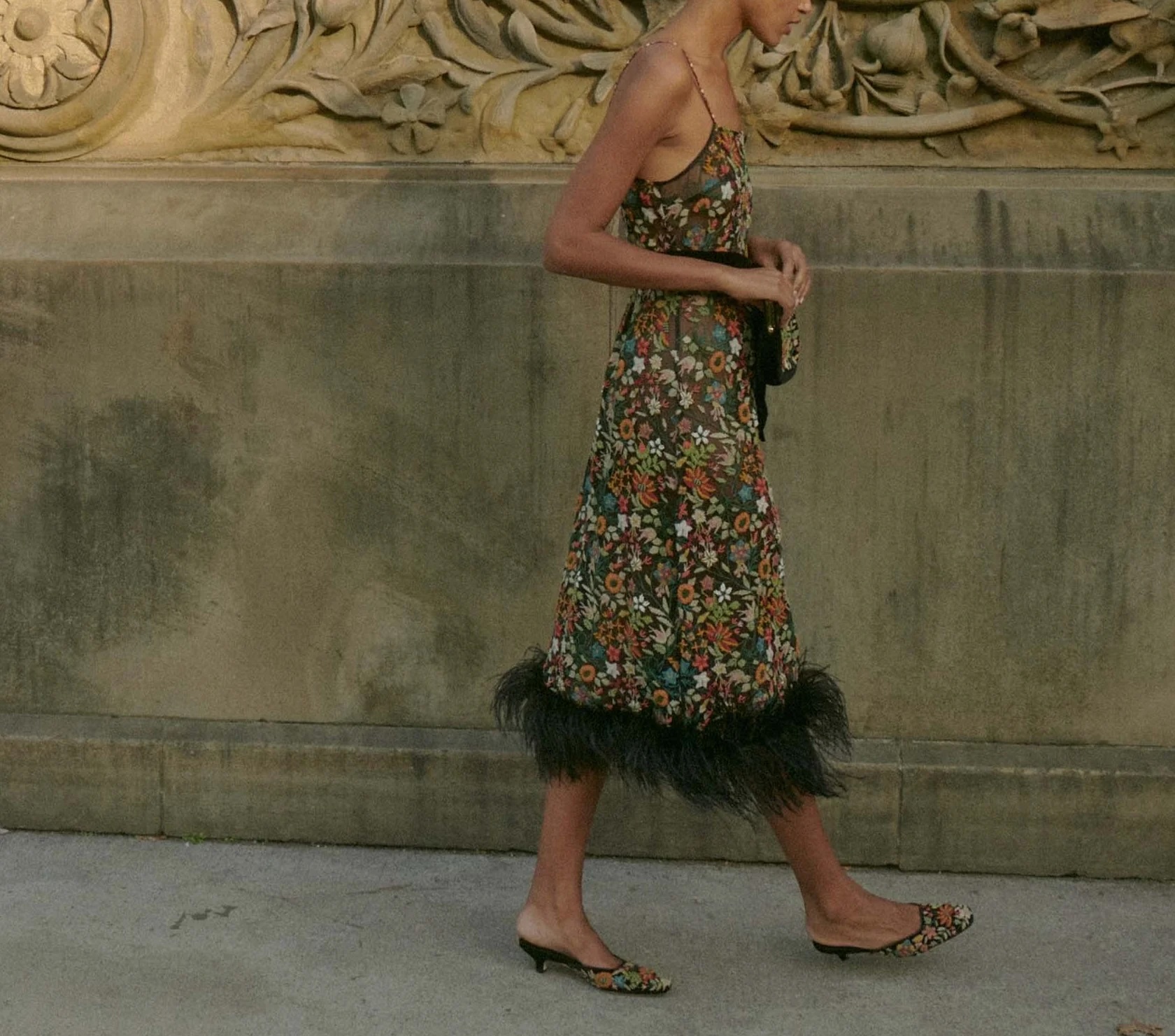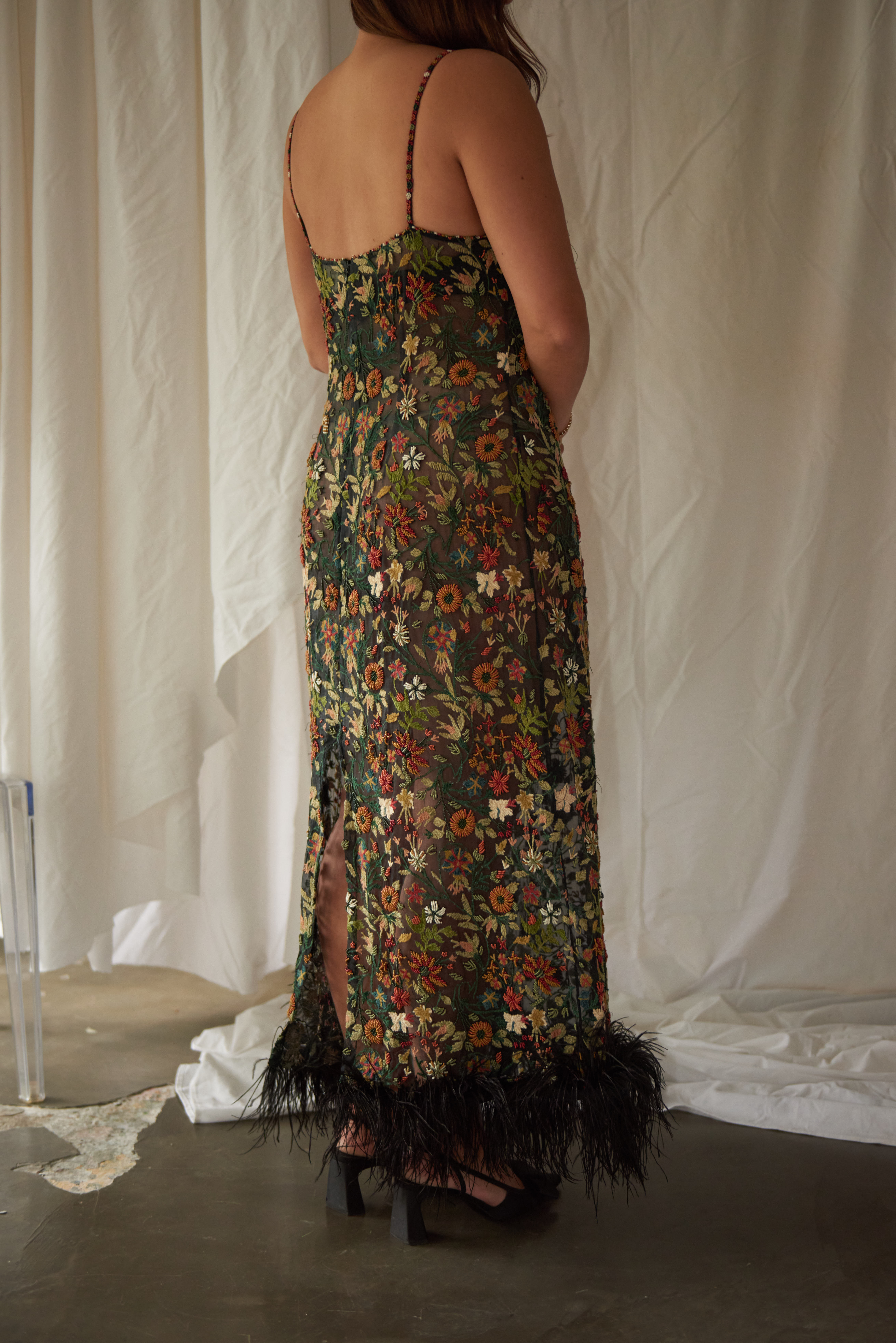 SaveDescription: Doen embroidered silk dress with hand bearing, silk embroidery and feather trim. Size: Medium. Fits a 10/12