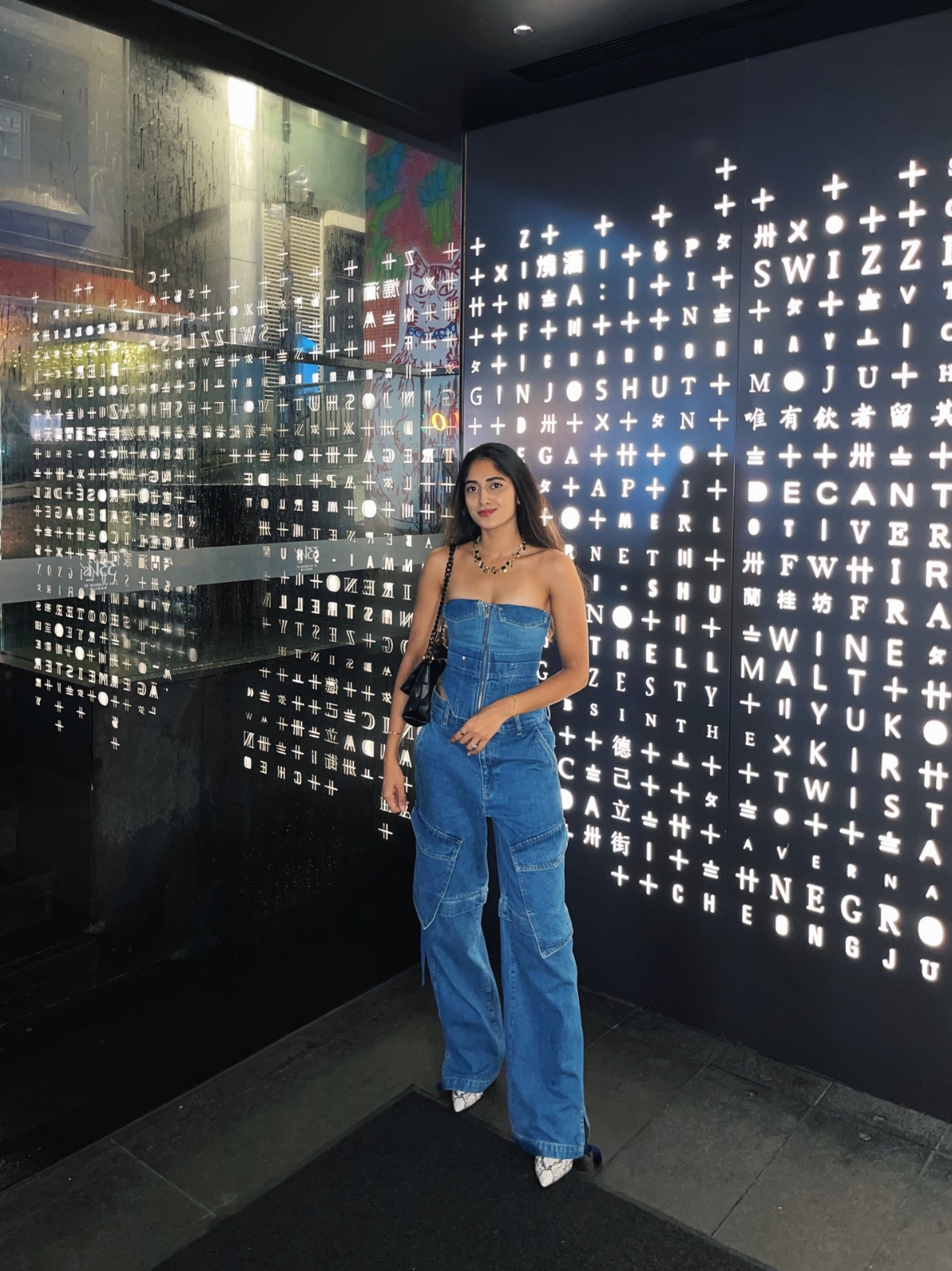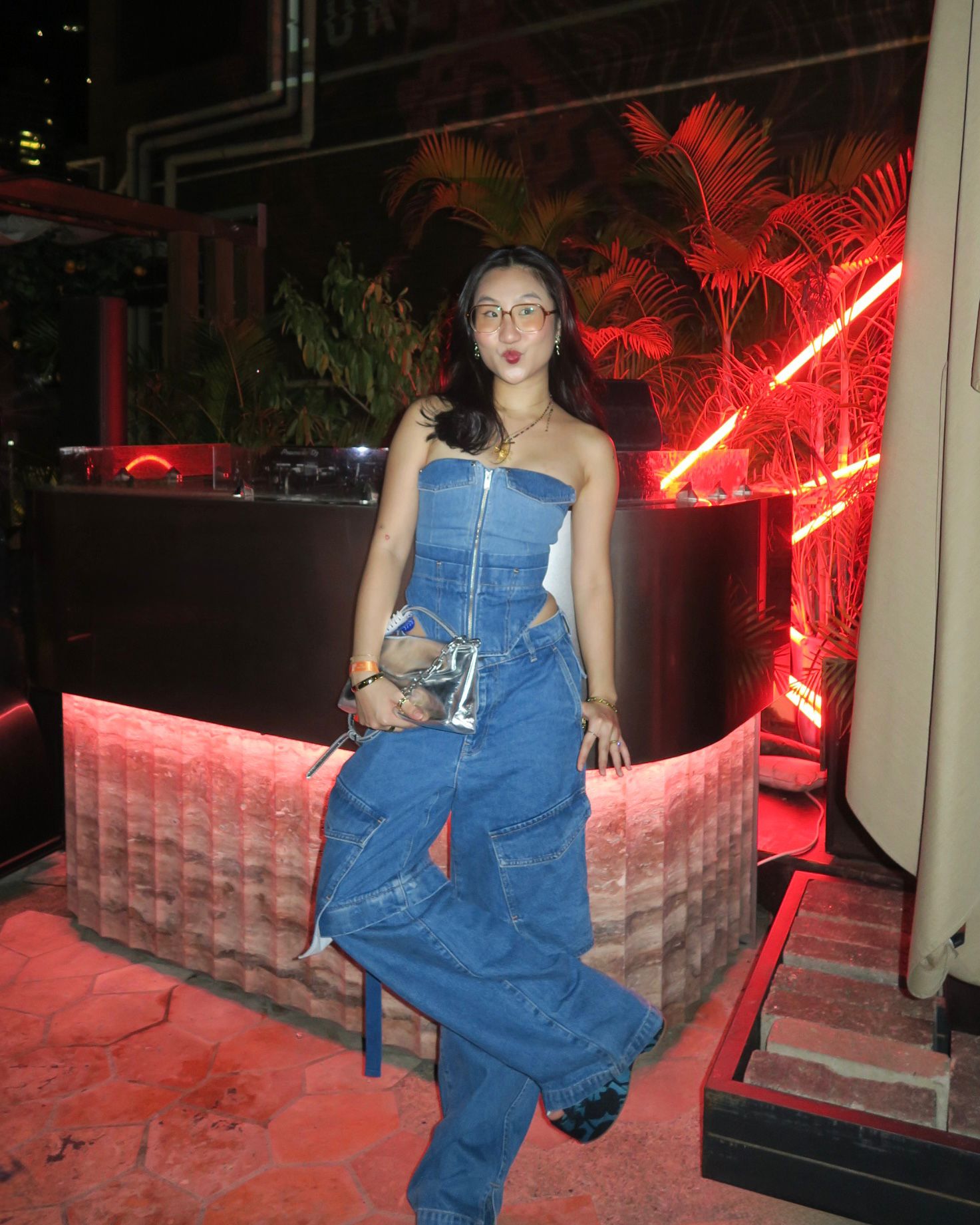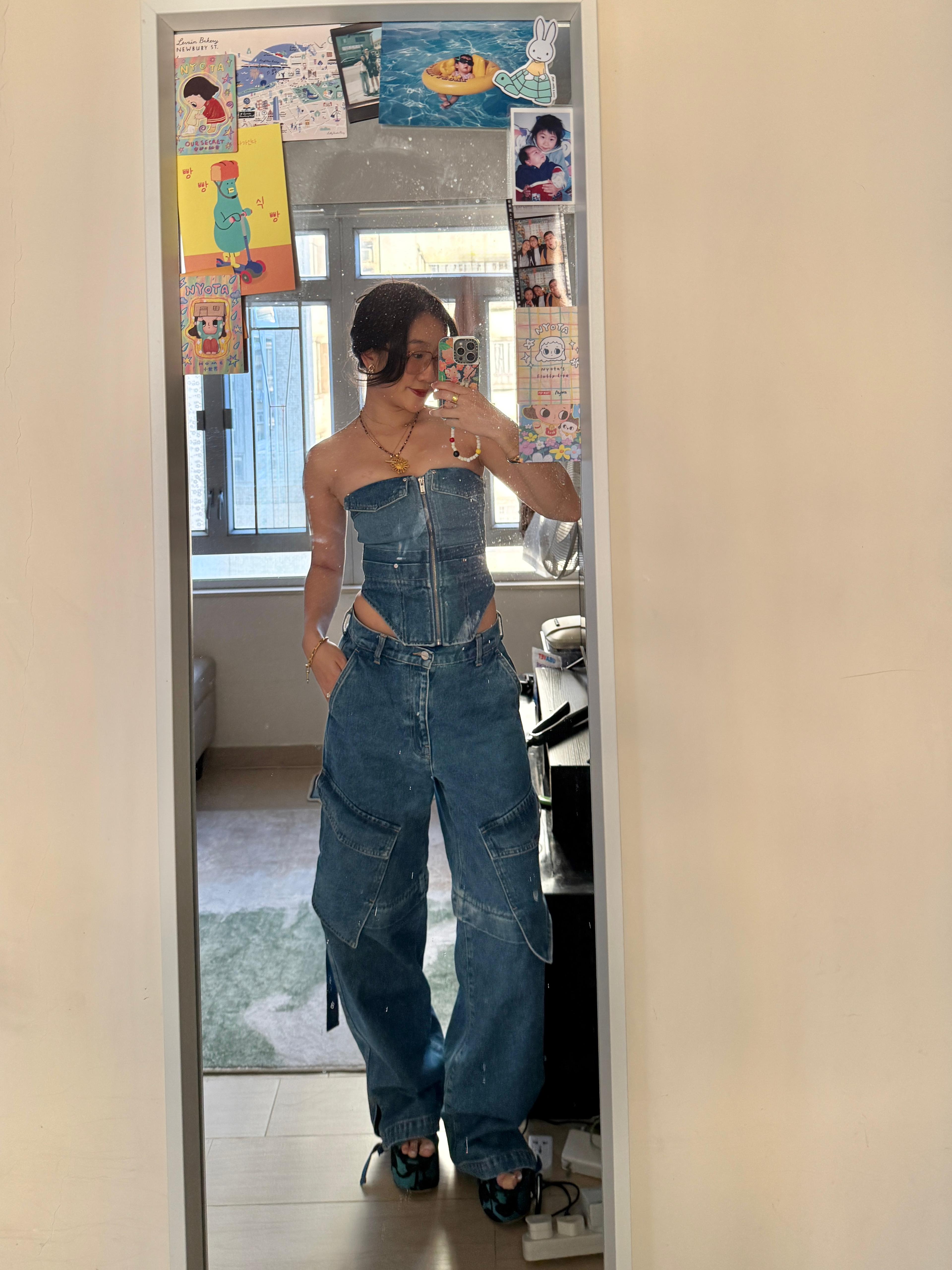 Description: Fitted denim corset and low-rise baggy jeans set.