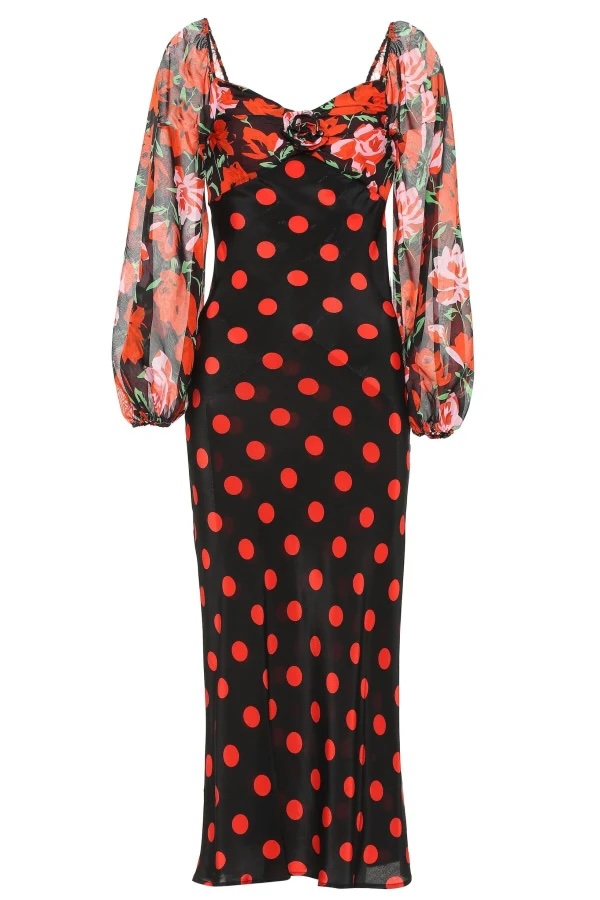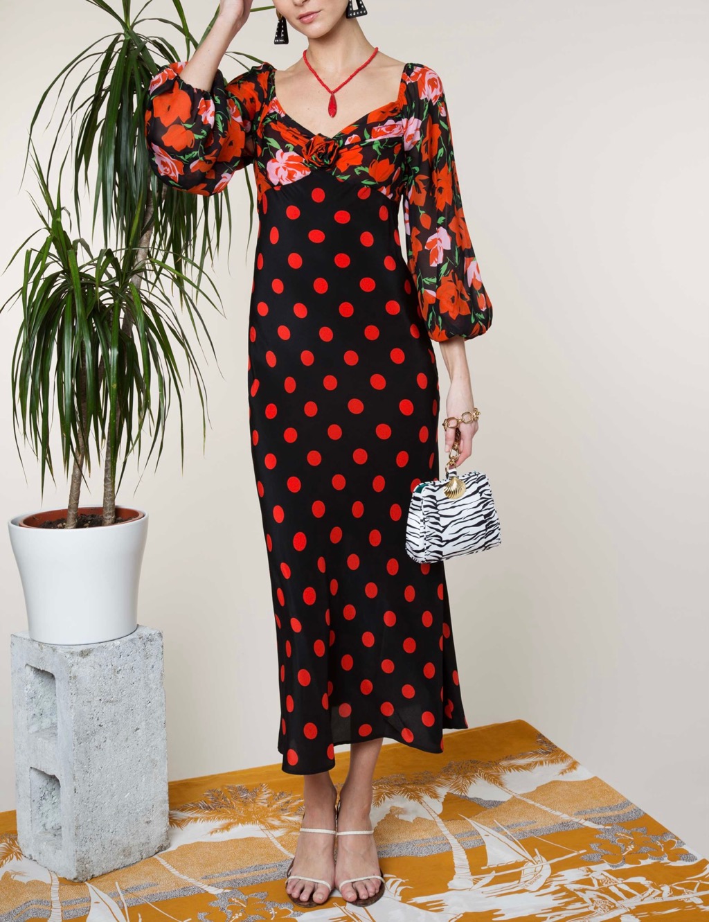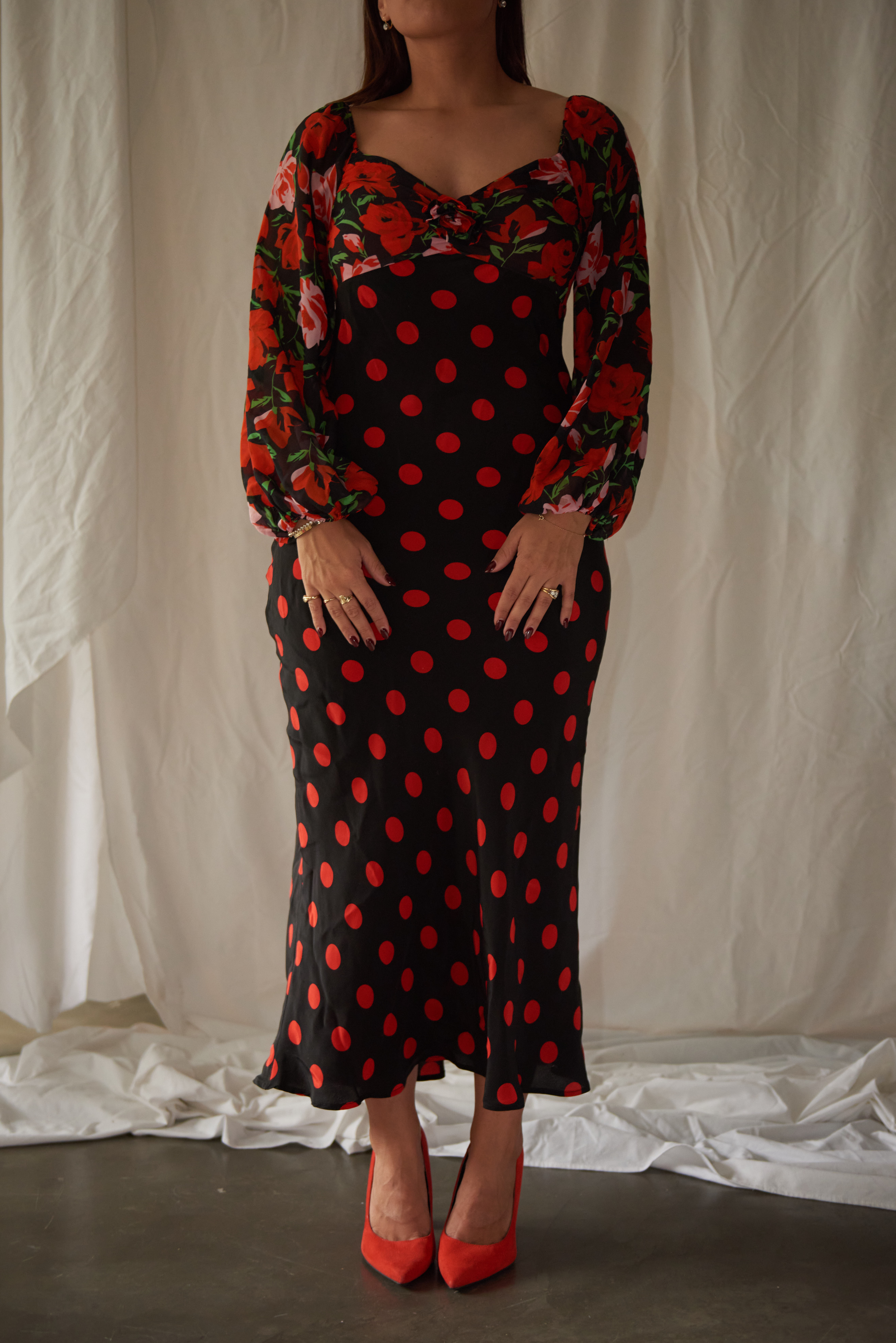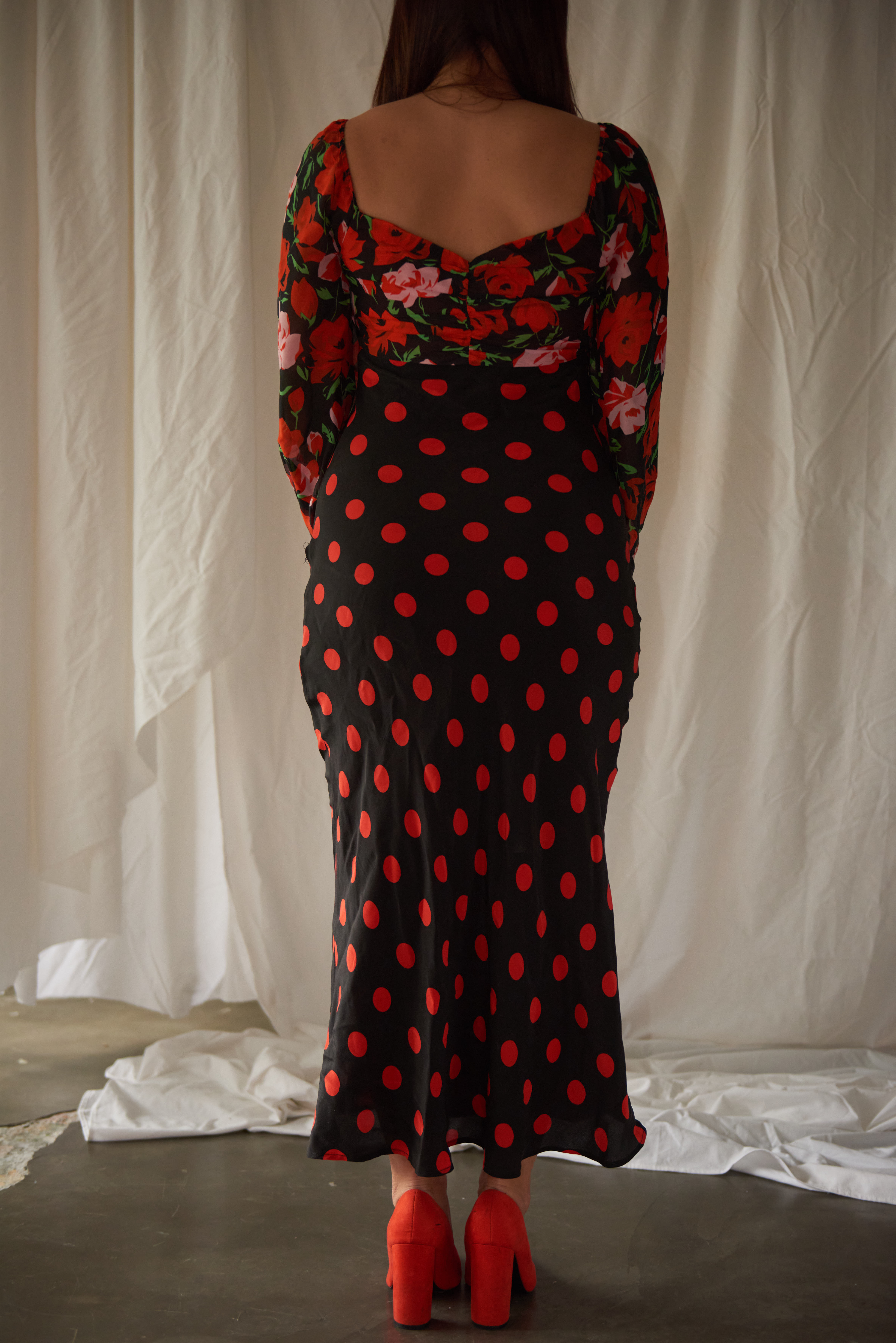 SaveDescription: Rixo size M (UK12), off shoulder rixo mixed print polka dot/rose midi dress.