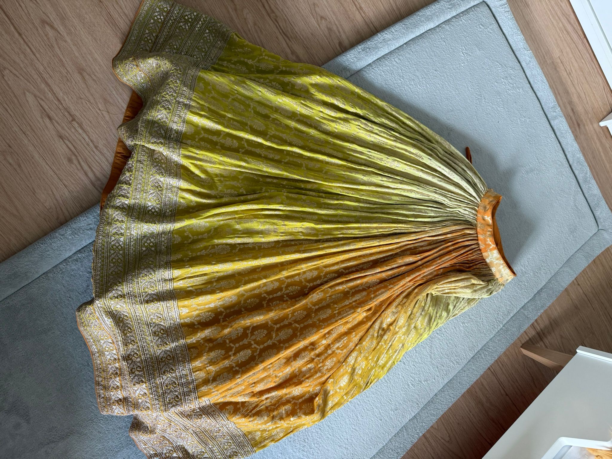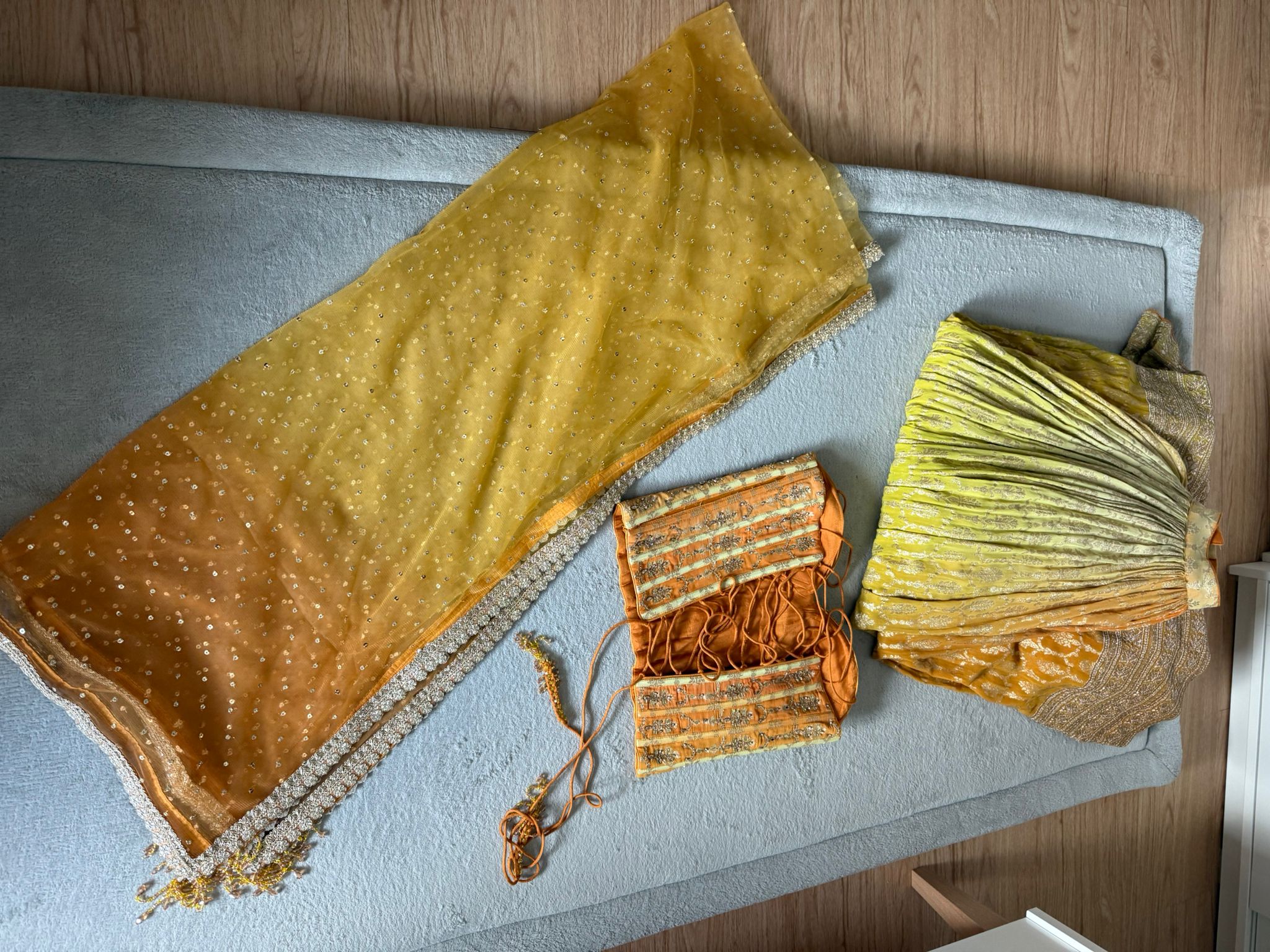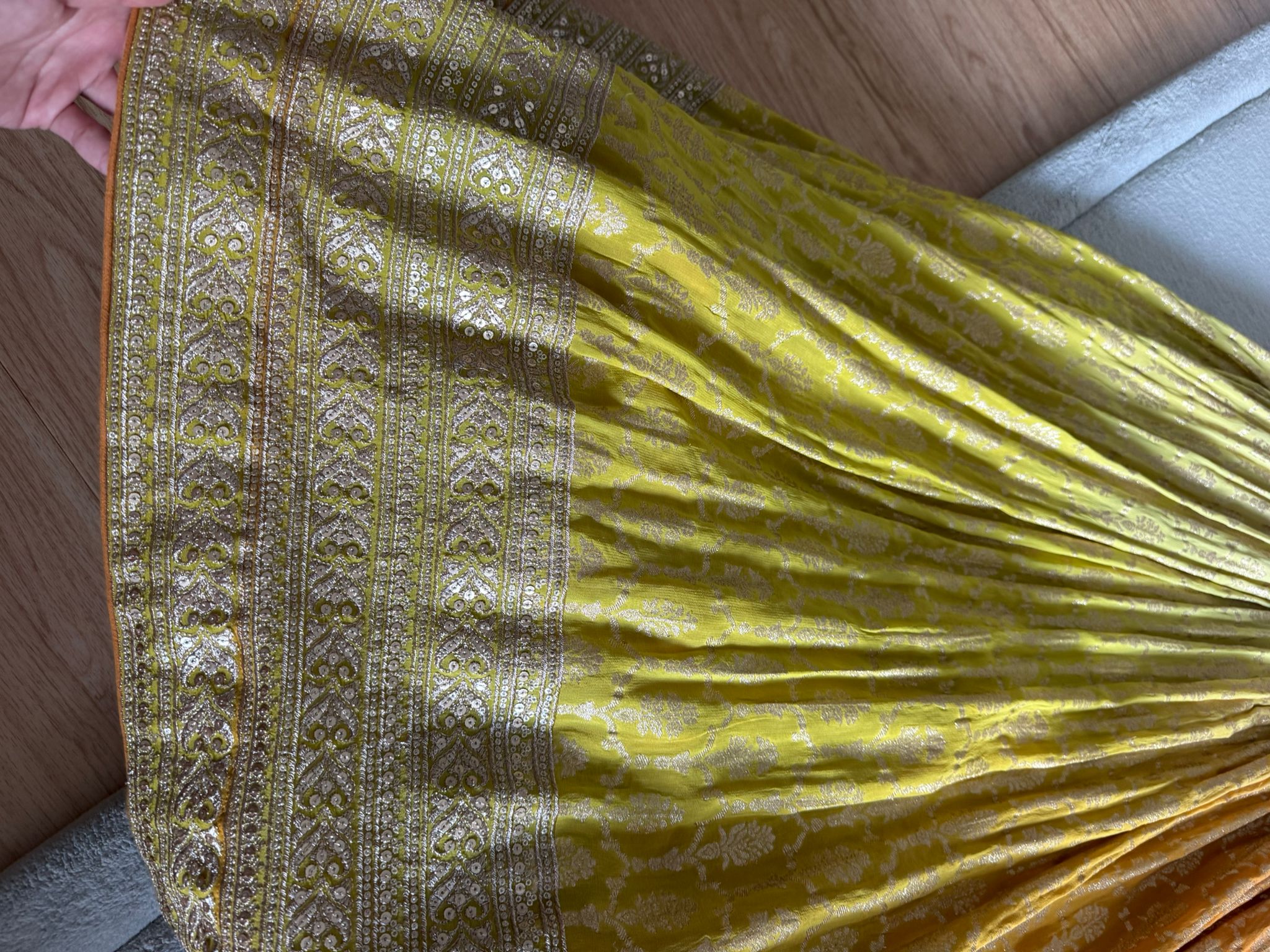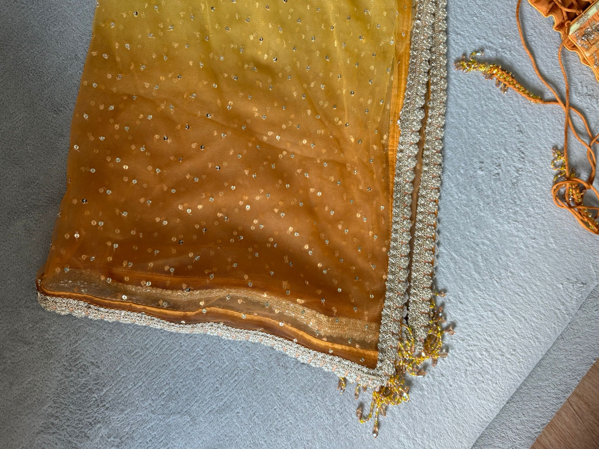 Description: Description Embroidery : Sequins, Flower Sequins, Stones Fabric : Georgette Color : Yellow No. Of Components : 3 Contents : Corset Blouse, Lehenga, Dupatta Neckline : Sweetheart Sleeve : Sleeveless Can Can : Yes Blouse Padding : Yes Model Height : 5"7 Care : Dry Clean Only