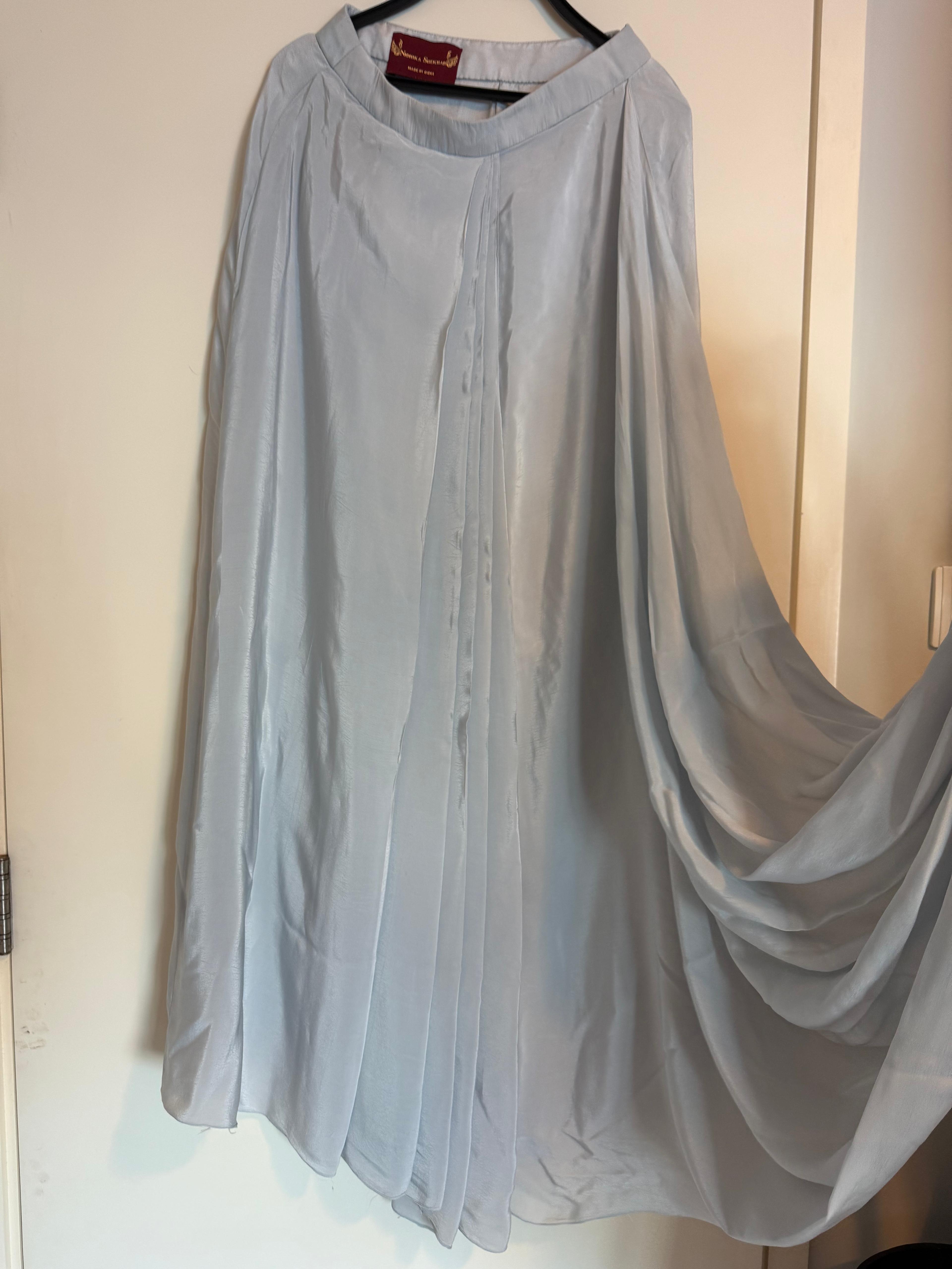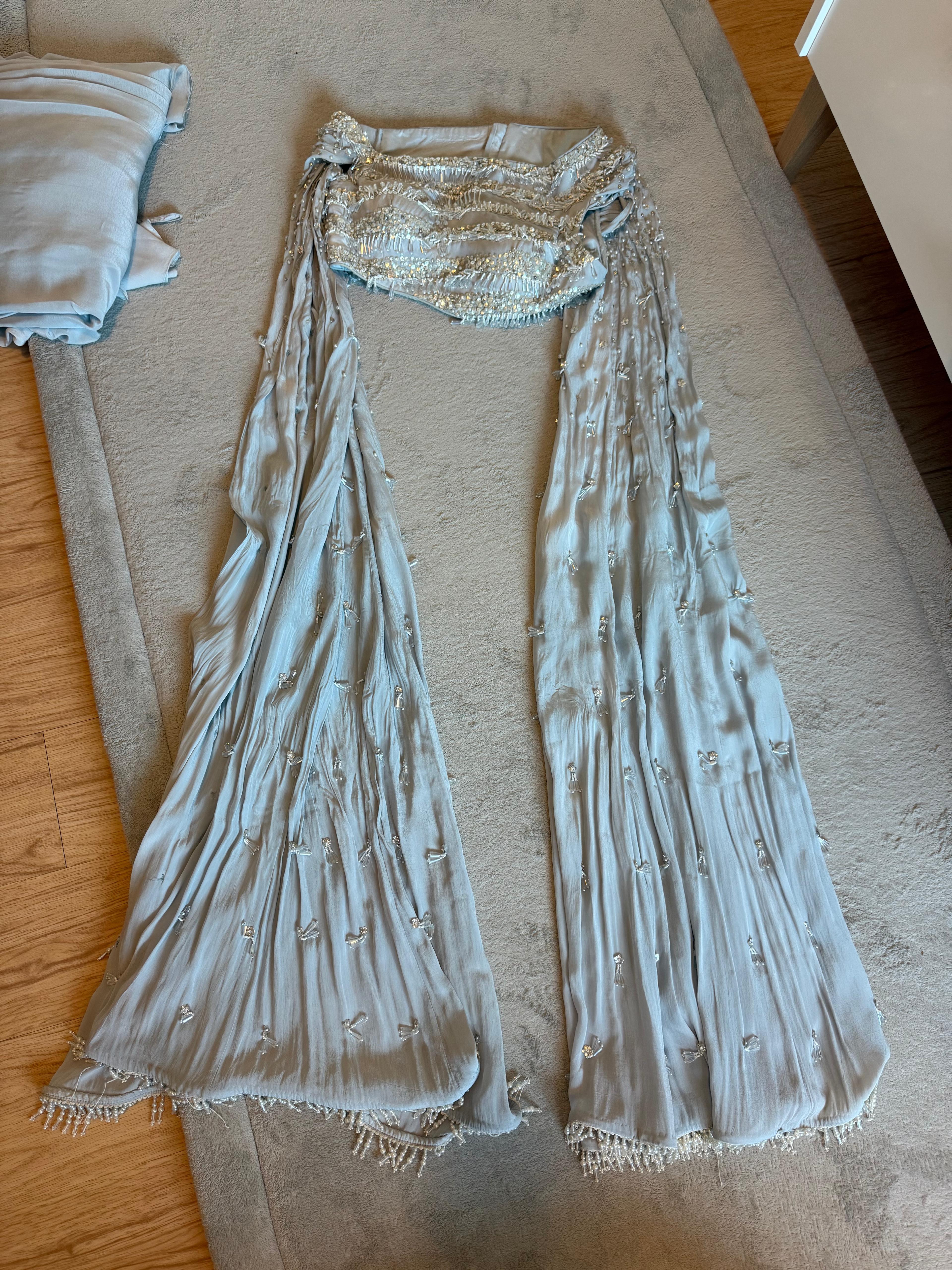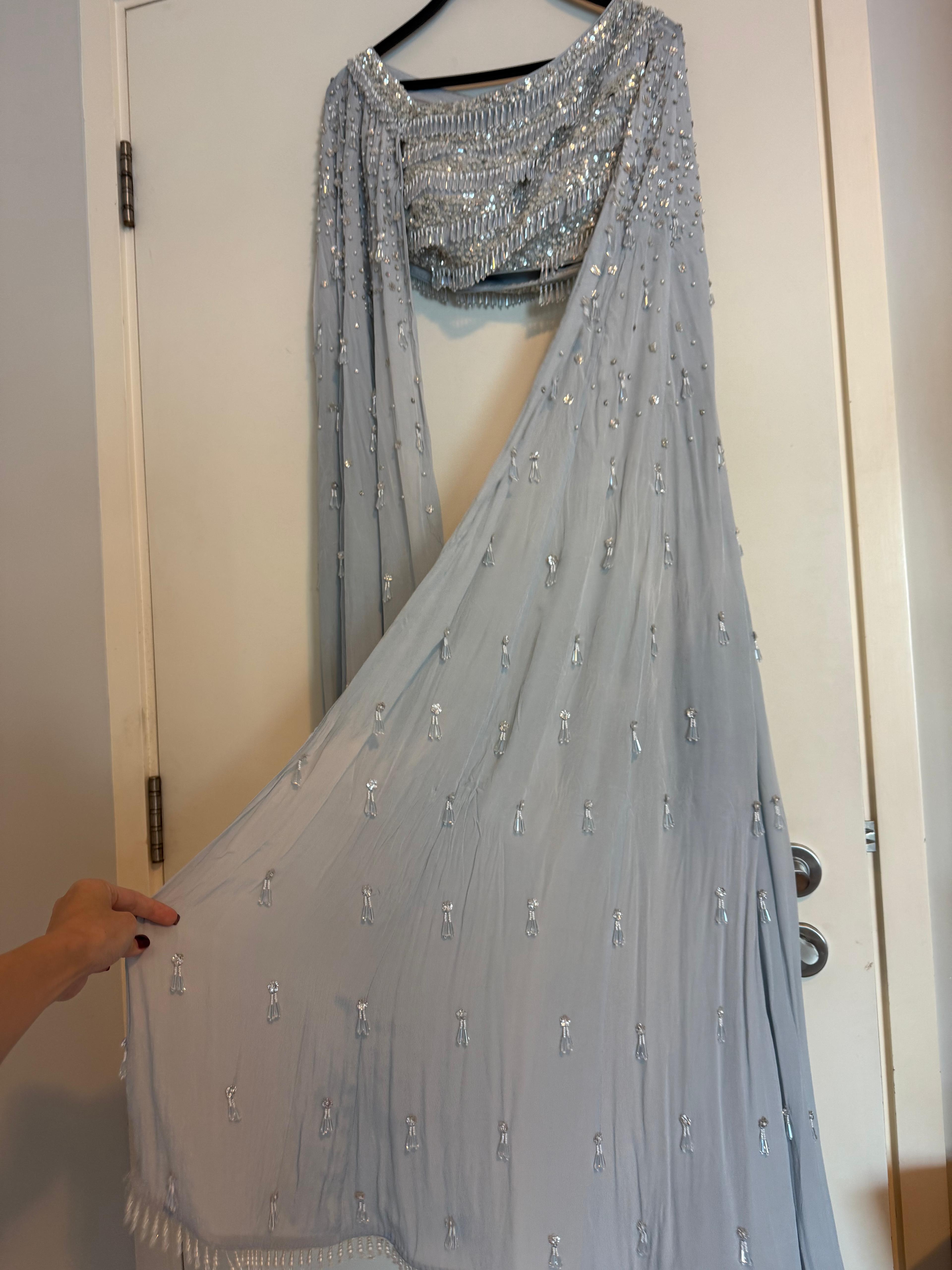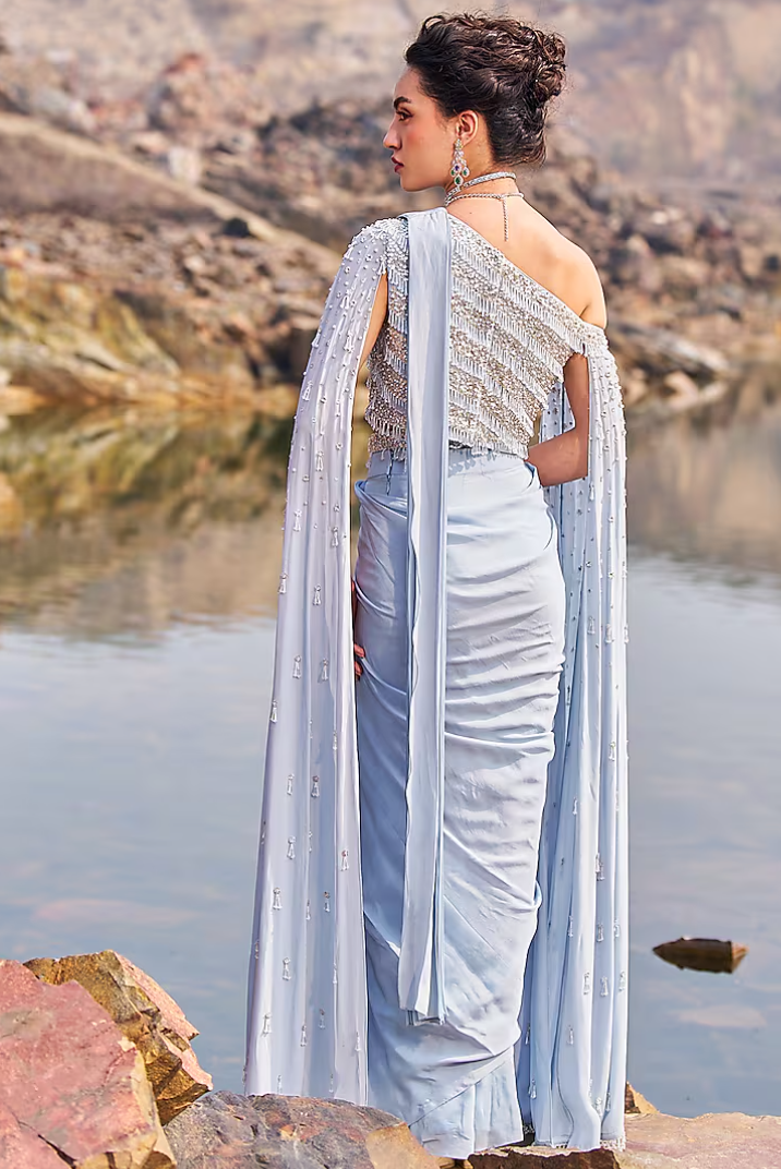 Description: Nidhika Shekhar features a mesmerizing Aqua Draped Saree Set that captivates with its elegance. The eye-catching draped saree is crafted in crepe with sequins embroidery and geometric pattern. It is paired with a cape one-shoulder blouse and a belt. Accessorize the designer saree set with statement earrings and heels for weddings or reception ceremonies, showcasing style and sophistication.