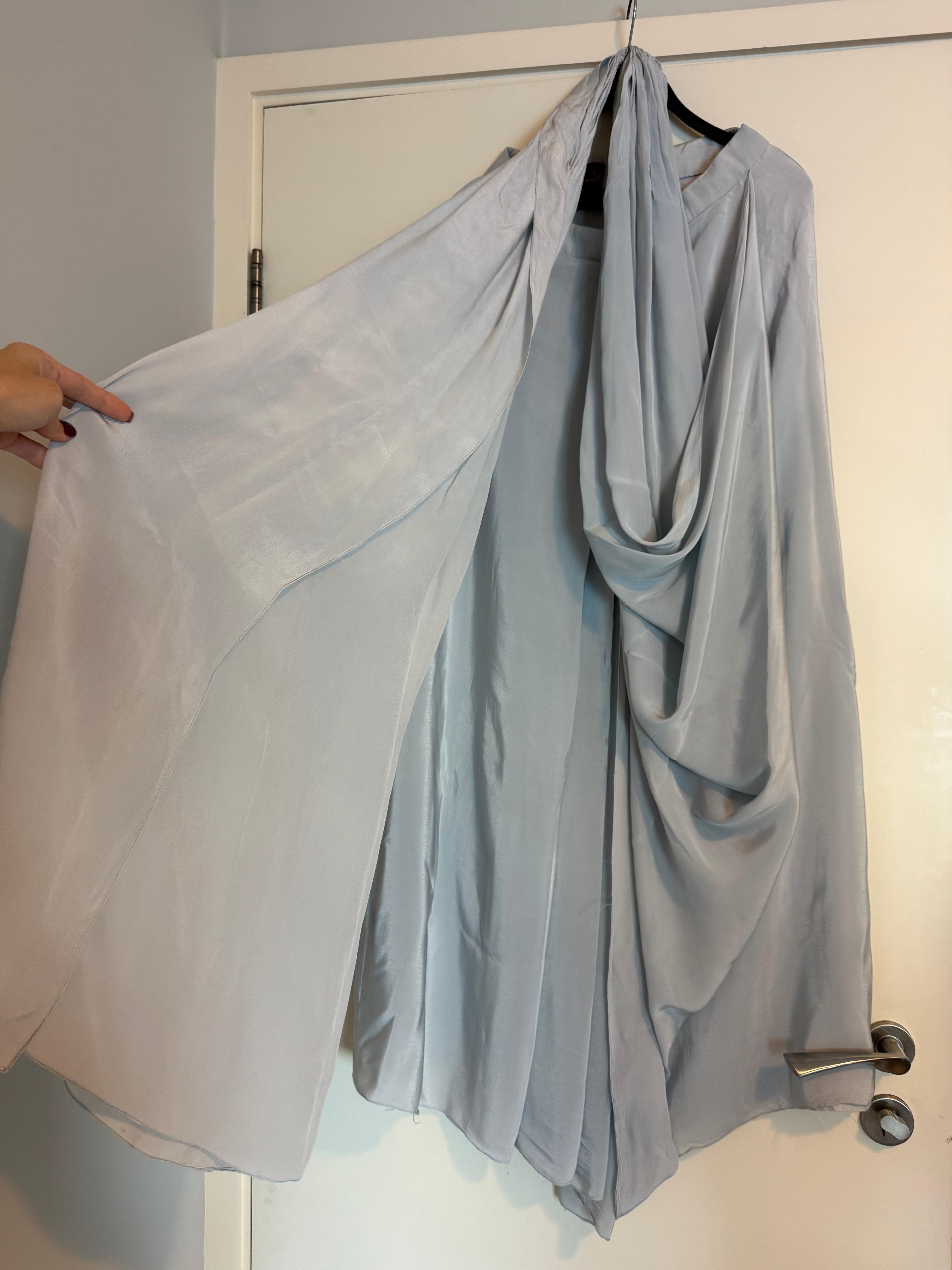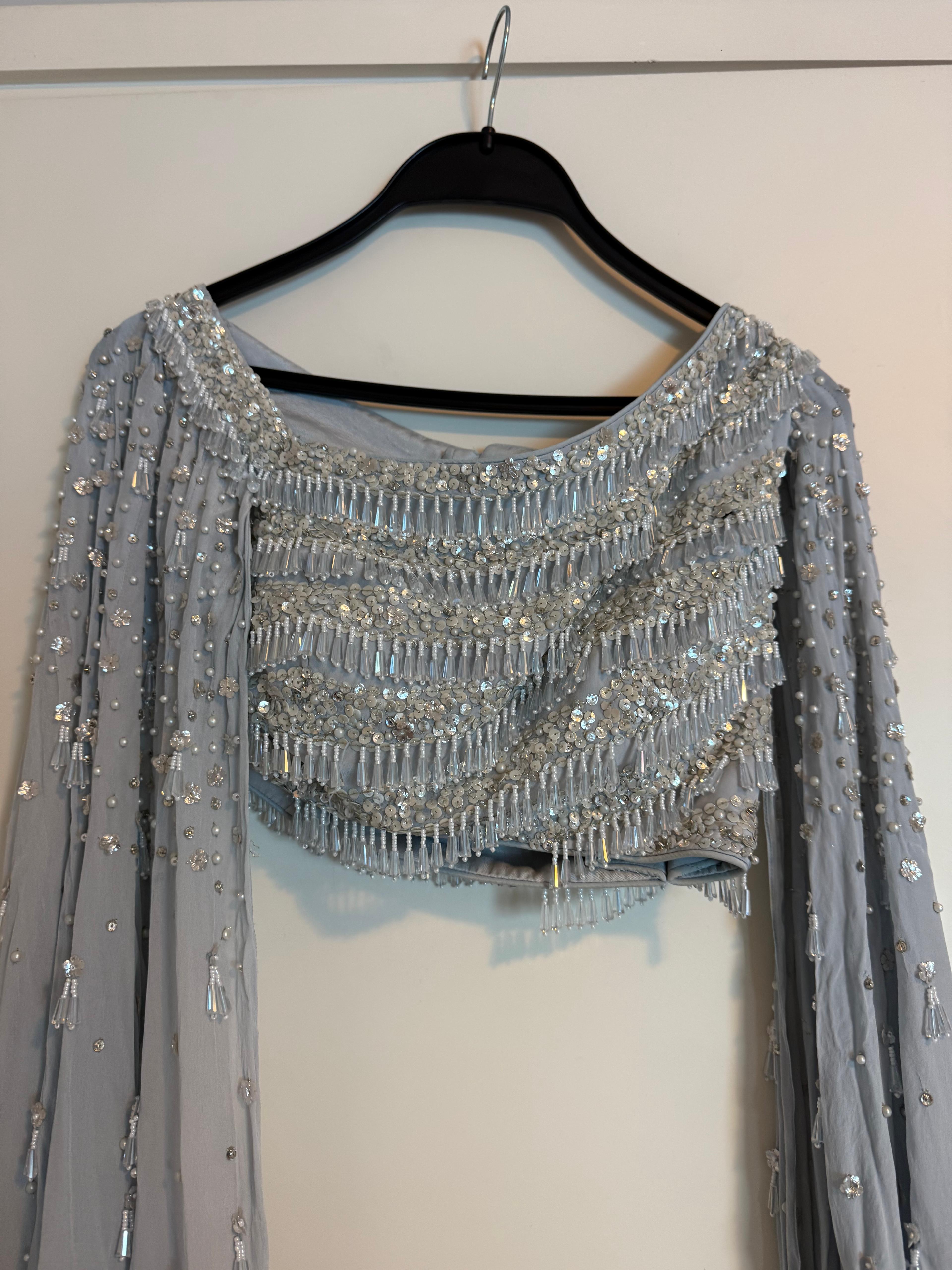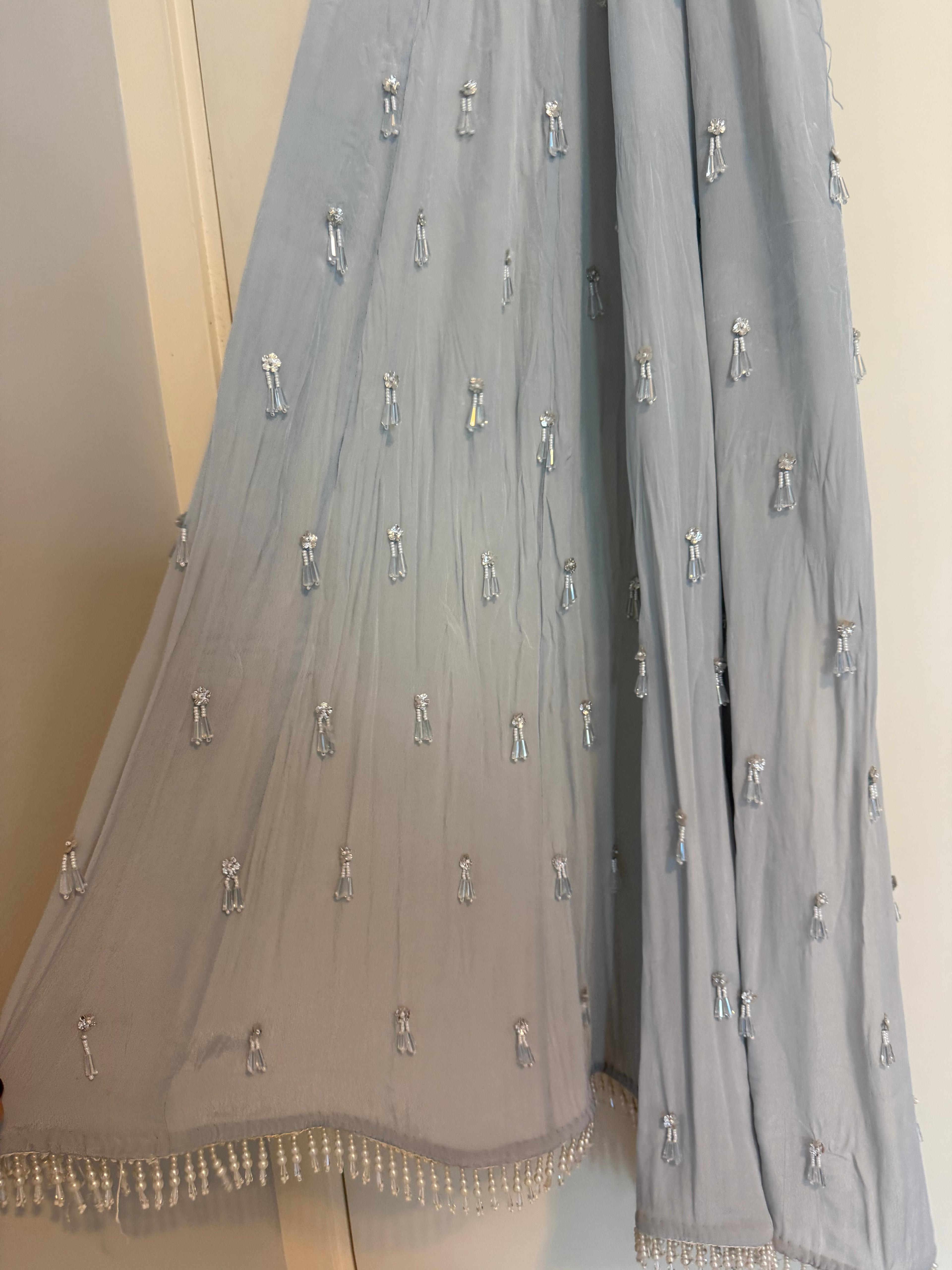 Description: Nidhika Shekhar features a mesmerizing Aqua Draped Saree Set that captivates with its elegance. The eye-catching draped saree is crafted in crepe with sequins embroidery and geometric pattern. It is paired with a cape one-shoulder blouse and a belt. Accessorize the designer saree set with statement earrings and heels for weddings or reception ceremonies, showcasing style and sophistication.