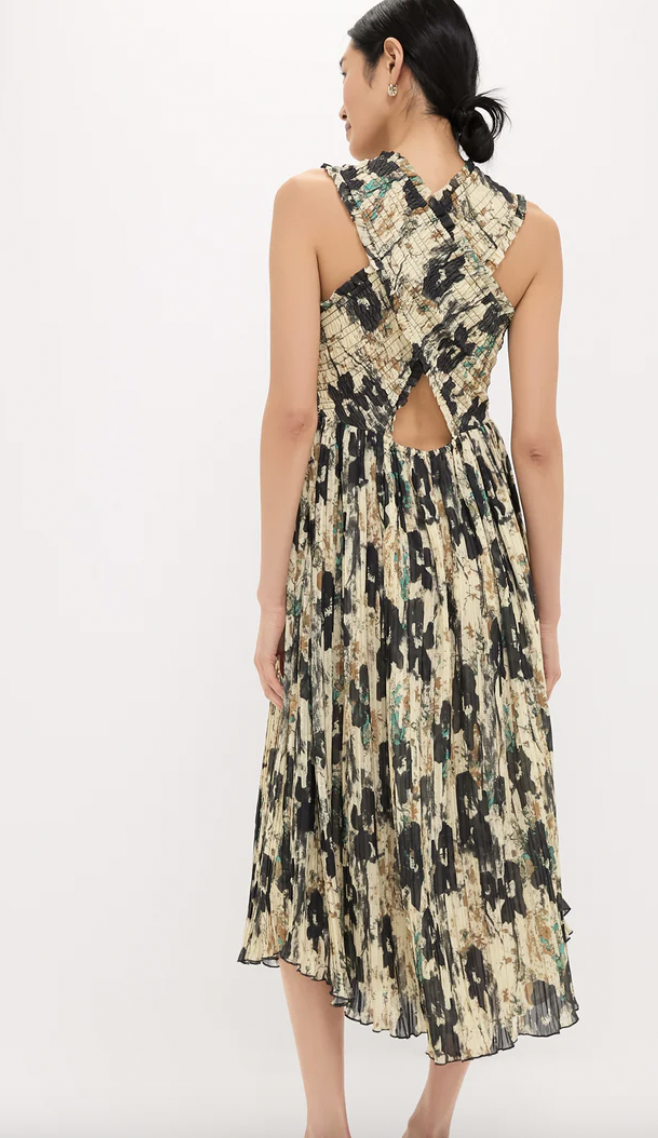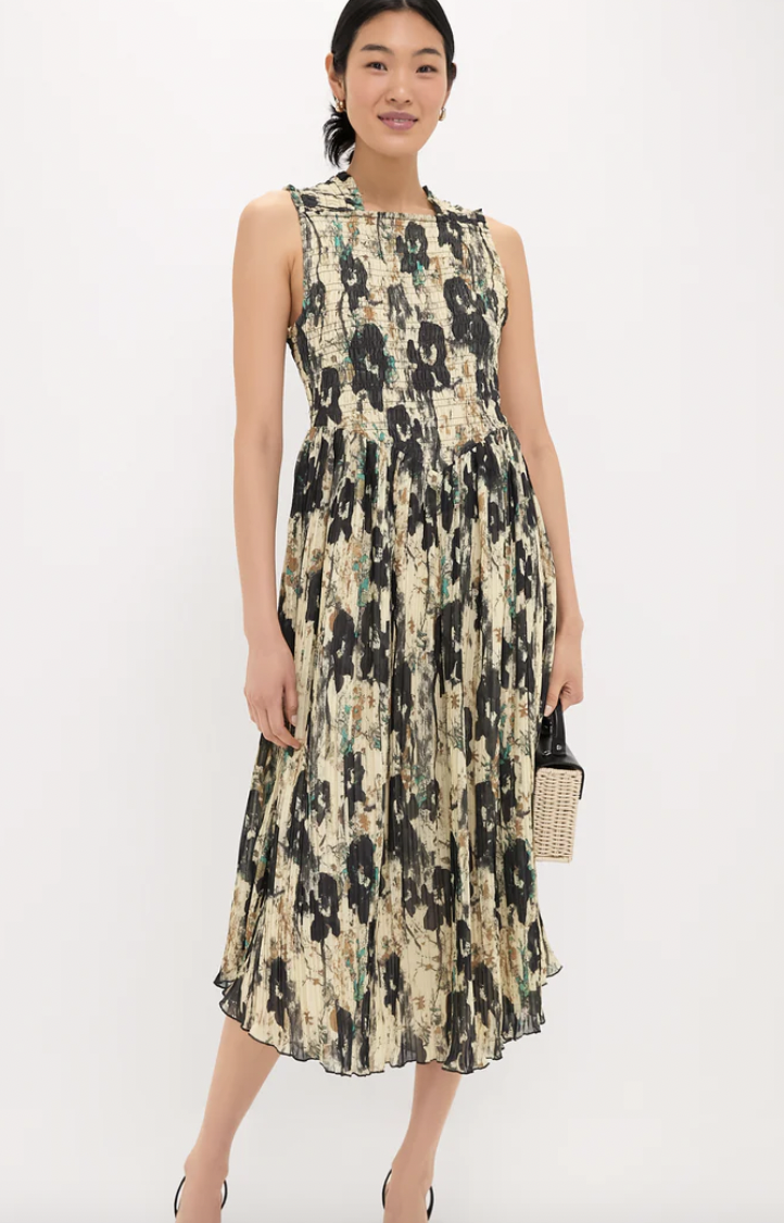 Description: Ganni Printed Pleats Smock Midi Straps Dress in Beige. Labelled size 36. Shirred around the bust so no bra needed. Crossover design at the back. Flattering and great for casual wear with flats or styled-up for an event.