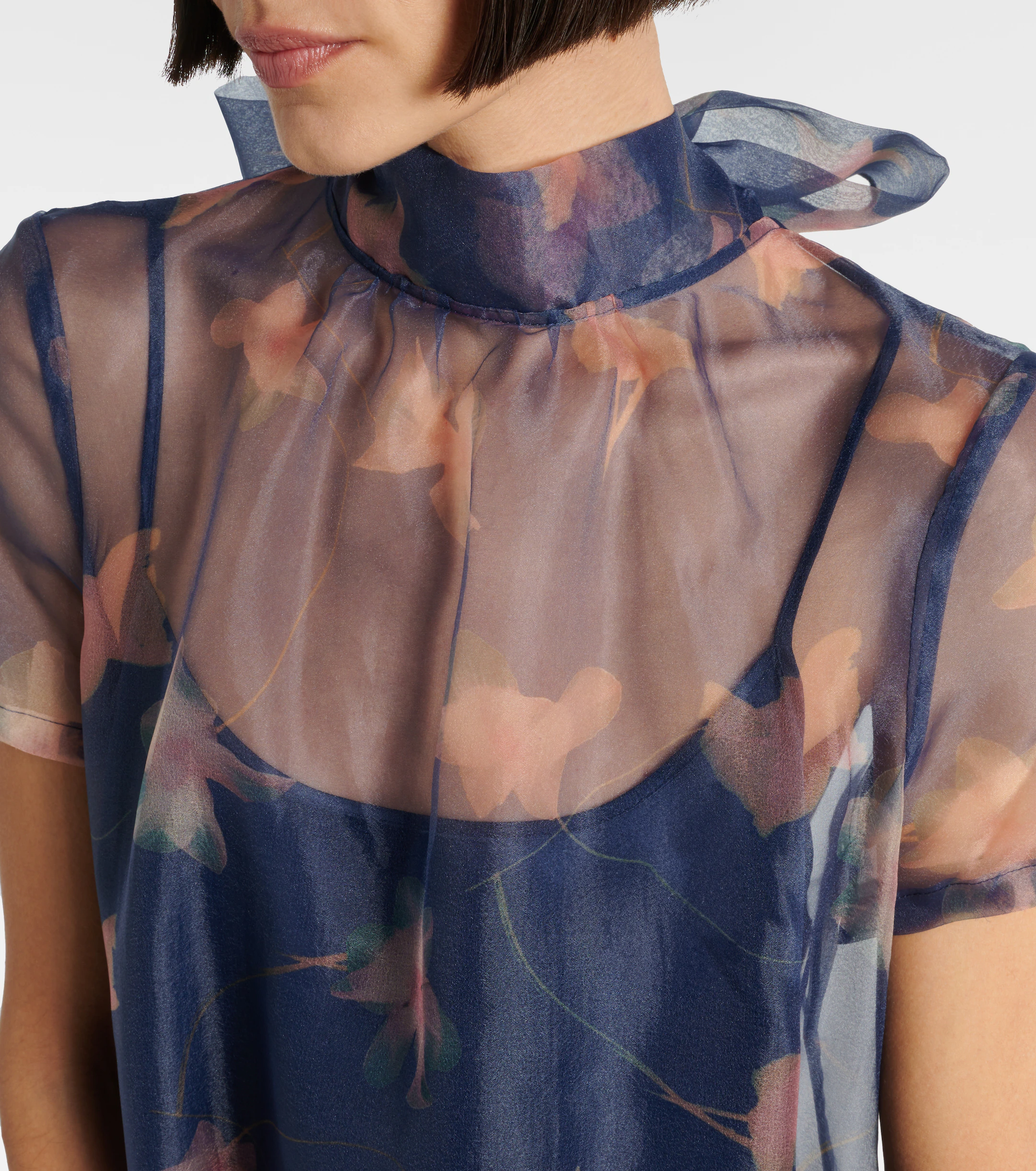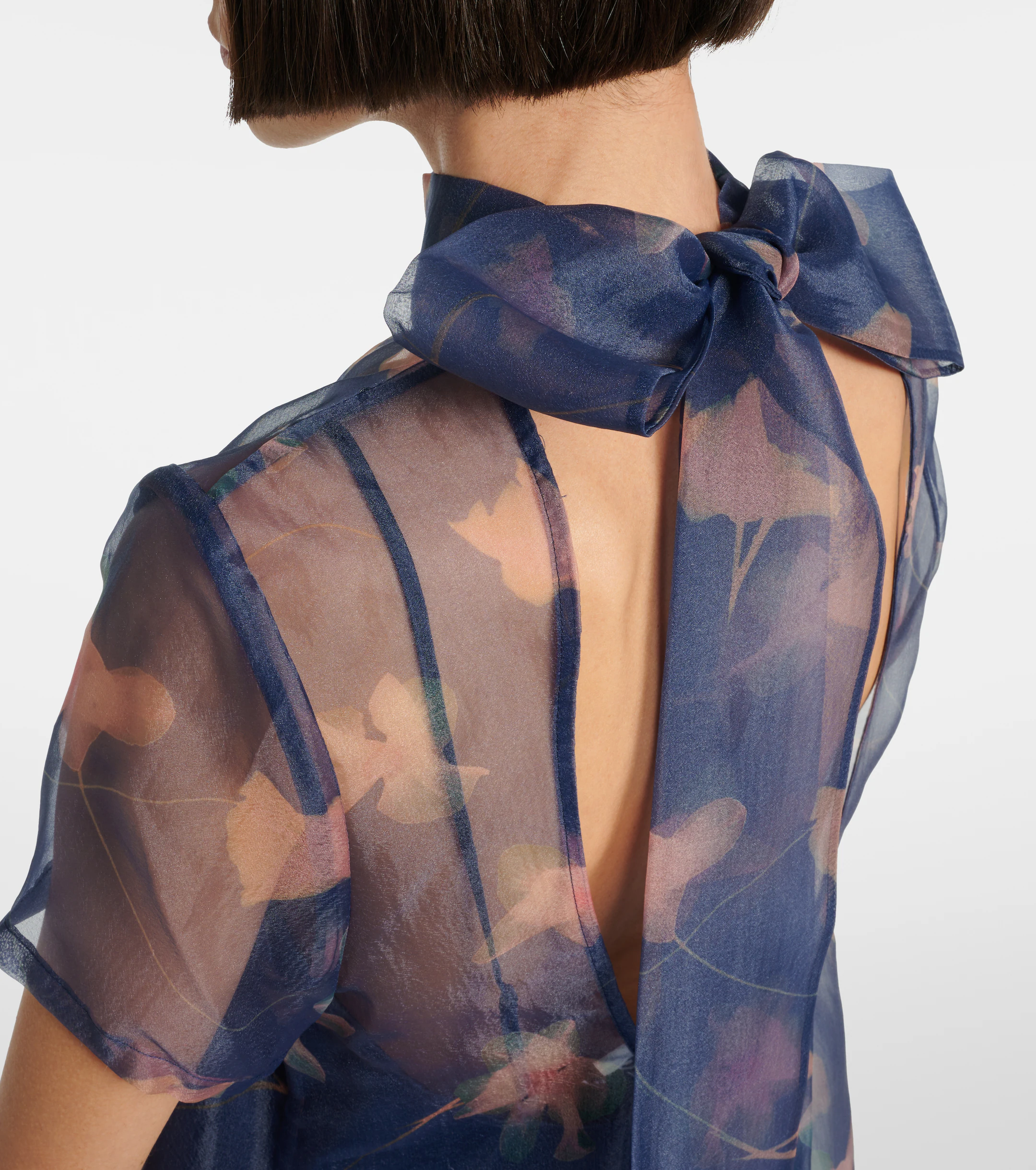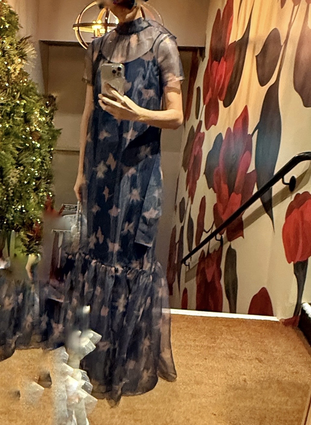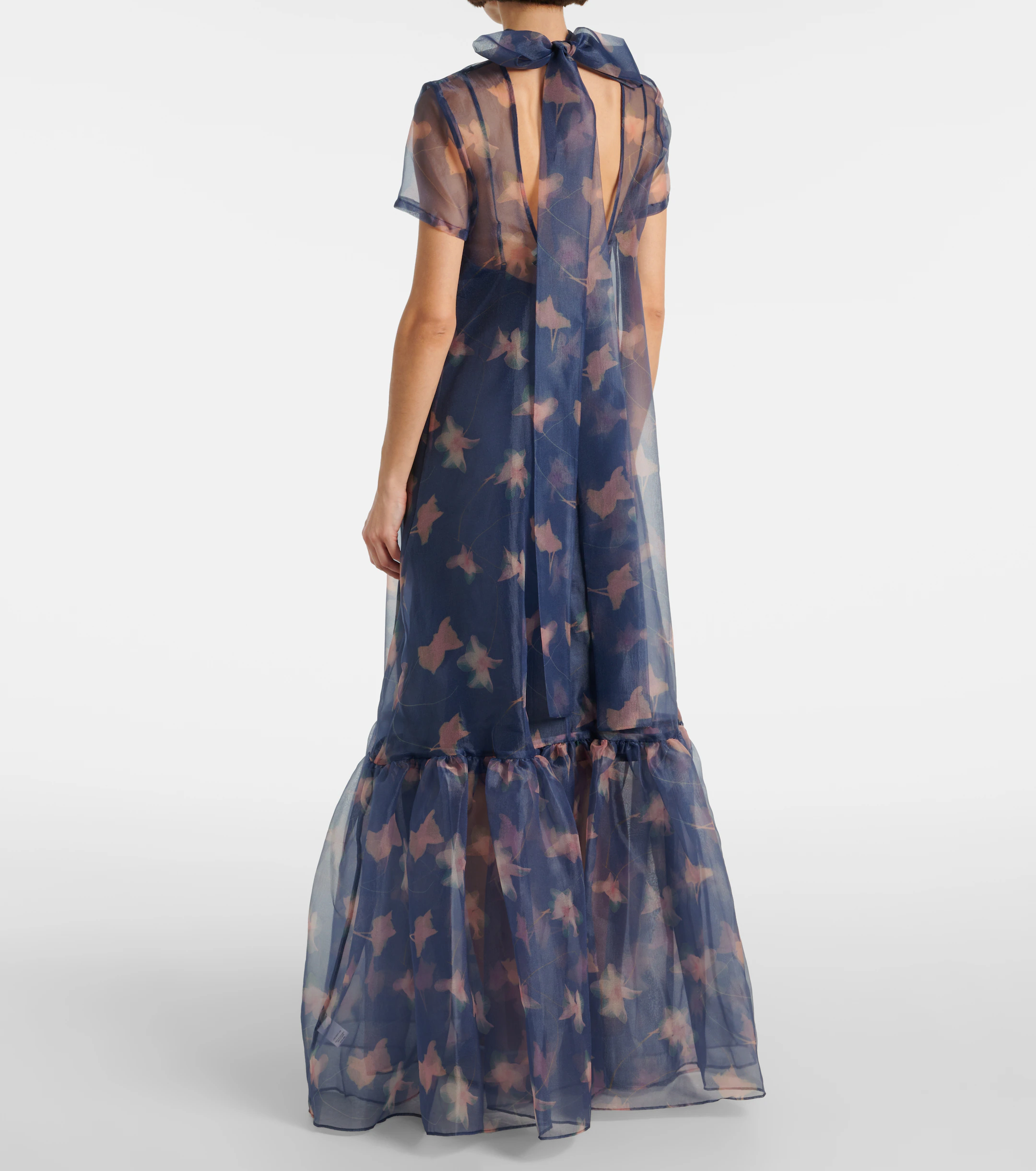 Description: “Lapis floral” print on organza with dark blue satin slip. Loose shape with a low back and zip, voluminous, tiered hem and dramatic bow at the back. The blue satin slip ensures coverage and has adjustable shoulder straps for a custom fit. Non-stretchy, lightweight, fits true to size. Perfect for formal occasions, such as weddings. Model is wearing XS, and is 5ft 10 (and wearing flats). In final photo: XS — 5ft 5 worn with 4 inch heels.